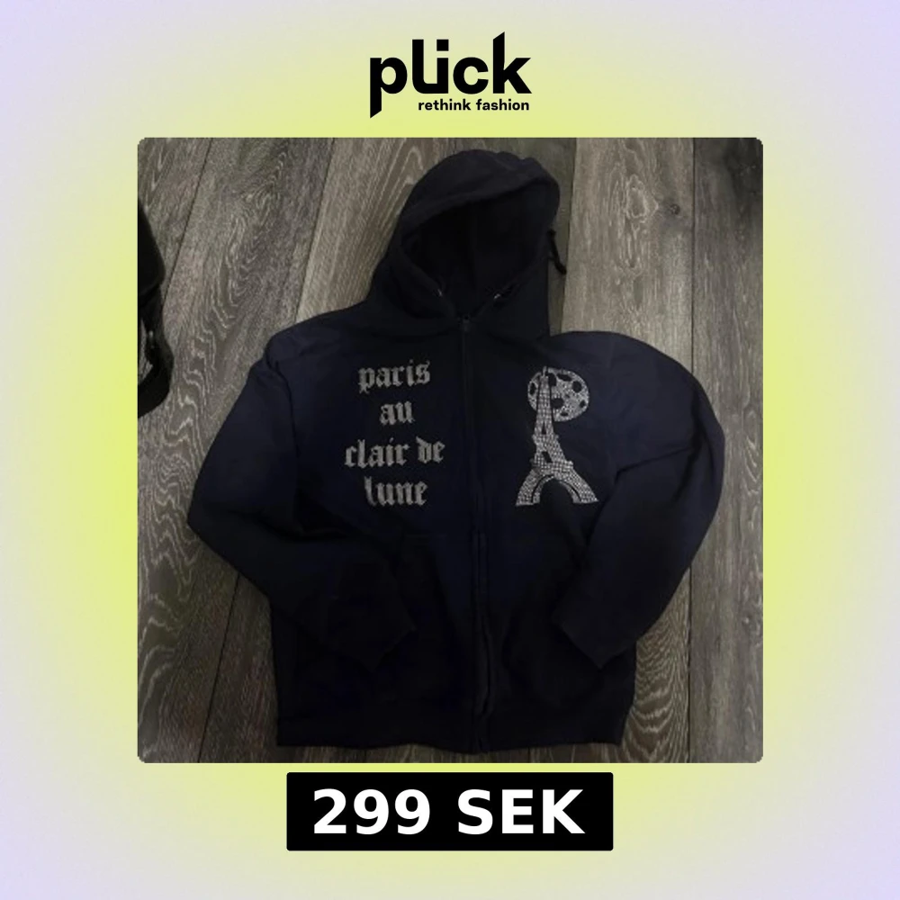 Mörkblå hoodie med dragkedja och huva. Framsidan har texten 'paris au clair de lune' i strass och en glittrig Eiffeltorn-design med måne. Perfekt statement-plagg för dig som gillar Paris-vibes och snygga detaljer.