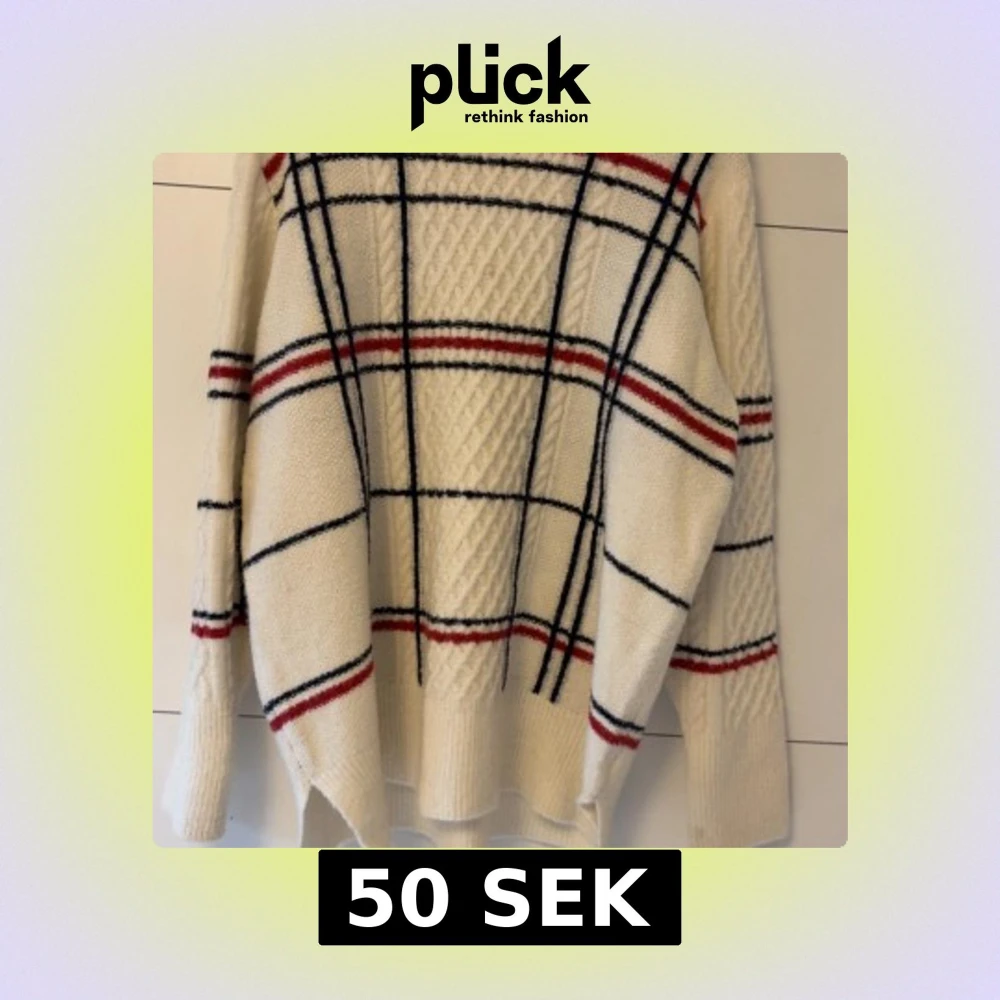 Säljer en vit stickad tröja med rutig design i svart och rött. Tröjan har långärmade ärmar och grovstickad struktur med snygga kabeldetaljer framtill. Perfekt för dig som gillar klassisk stil med en twist.