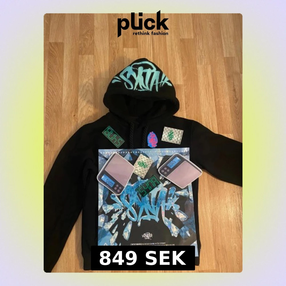 Svart hoodie från Syna World med stor graffiti-inspirerad logga i ljusblått på huvan. Flera färgglada tryck och digitala motiv på bröstet ger en unik streetwear-vibe. Tröjan har snörning vid huvan och är långärmad, perfekt för dig som gillar bold och kreativ stil.