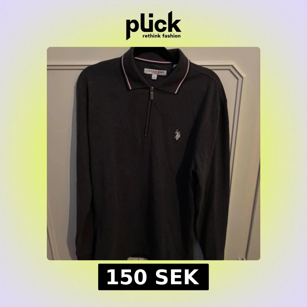 Svart långärmad pikétröja från U.S. Polo Assn. med klassisk krage och halv dragkedja. Tröjan har broderad logga på bröstet och kragen har snygga ränder i vitt och rött. Perfekt för en stilren och sportig look. Inprincip aldrig använt då den har varit för stor sedan köp.