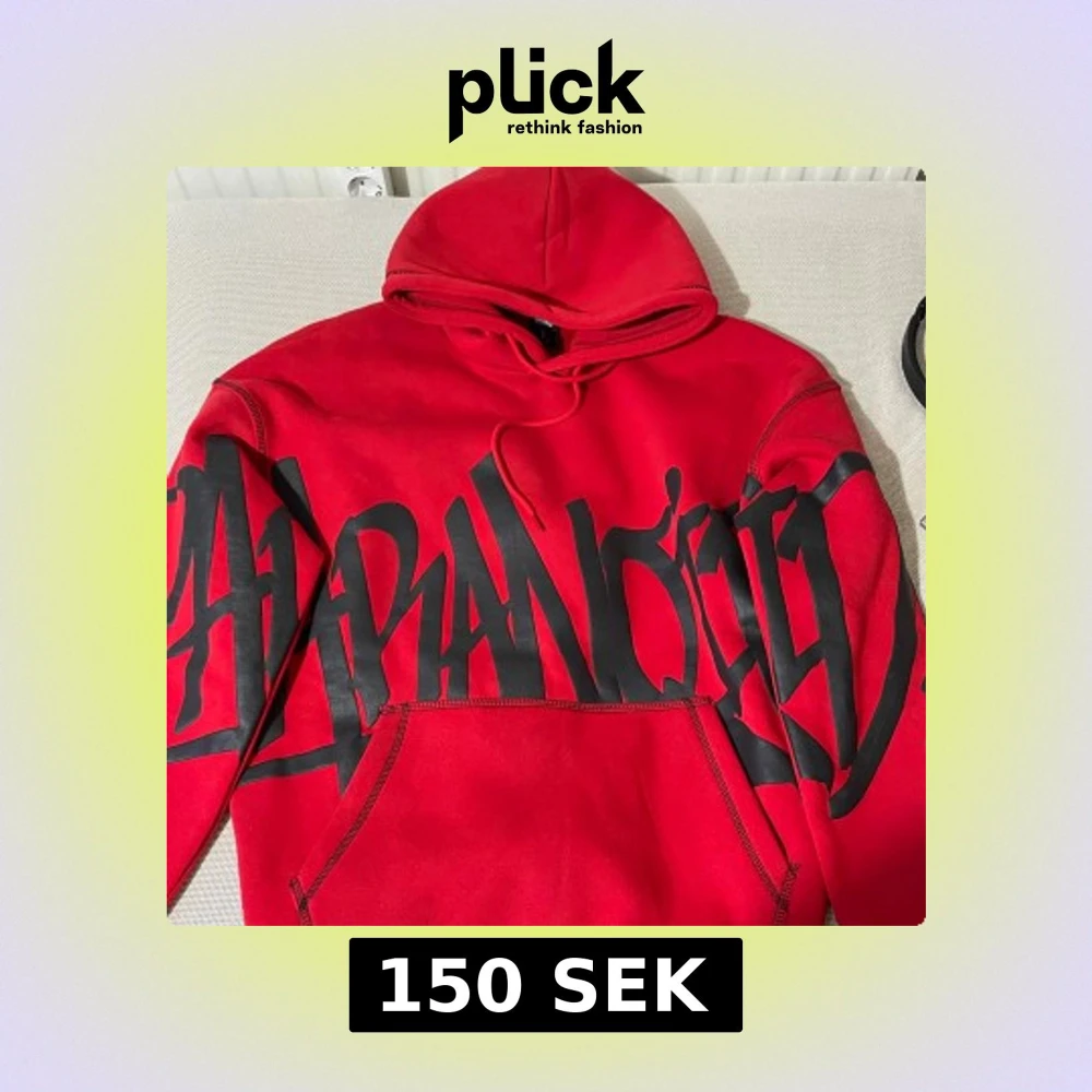 Säljer en röd hoodie med fett svart graffiti-tryck över bröstet och delar av ärmarna. Tröjan har huva med snörning och en stor magficka. Storlek S, oversized fit. Aldrig använd. Utan prislapp.