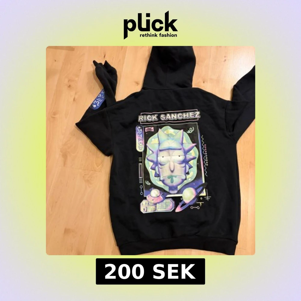 Svart hoodie med stor Rick Sanchez-tryck på ryggen och mindre Rick and Morty-logga på bröstet. Tröjan har huva med snörning och långa ärmar. Materialet är mjuk bomull och polyester, perfekt för dig som gillar coola prints och streetstyle.
