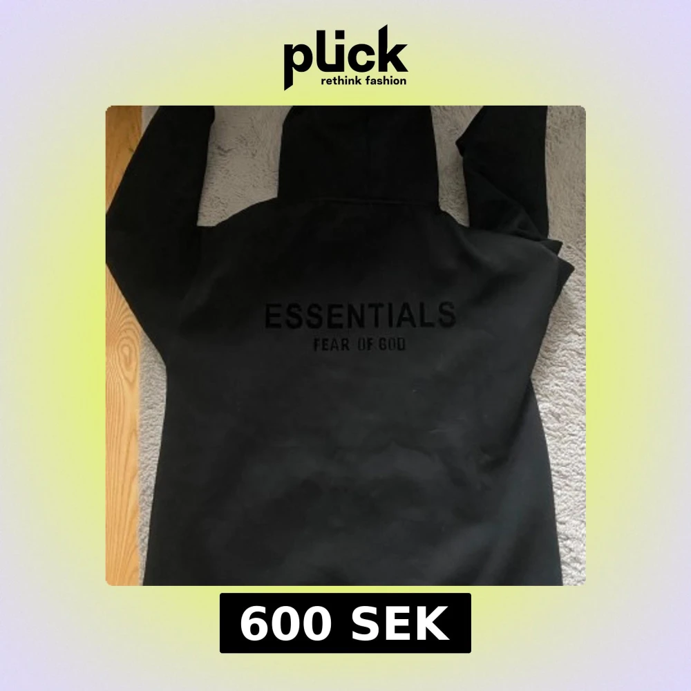 Säljer en svart hoodie från Essentials Fear of God. Tröjan har huva, magficka och tryck både fram och bak. Perfekt för dig som gillar streetwear och vill ha en stilren look.