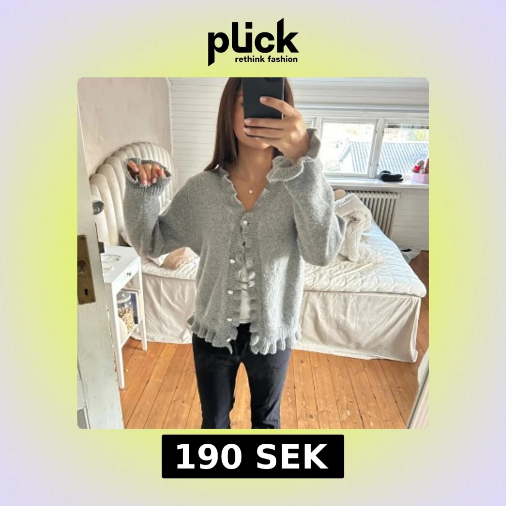 Mysig grå kofta med volangdetaljer längs knäppningen och ärmsluten. Perfekt för kyliga dagar och ger en stilren look. Koftan har långa ärmar och knappar framtill.