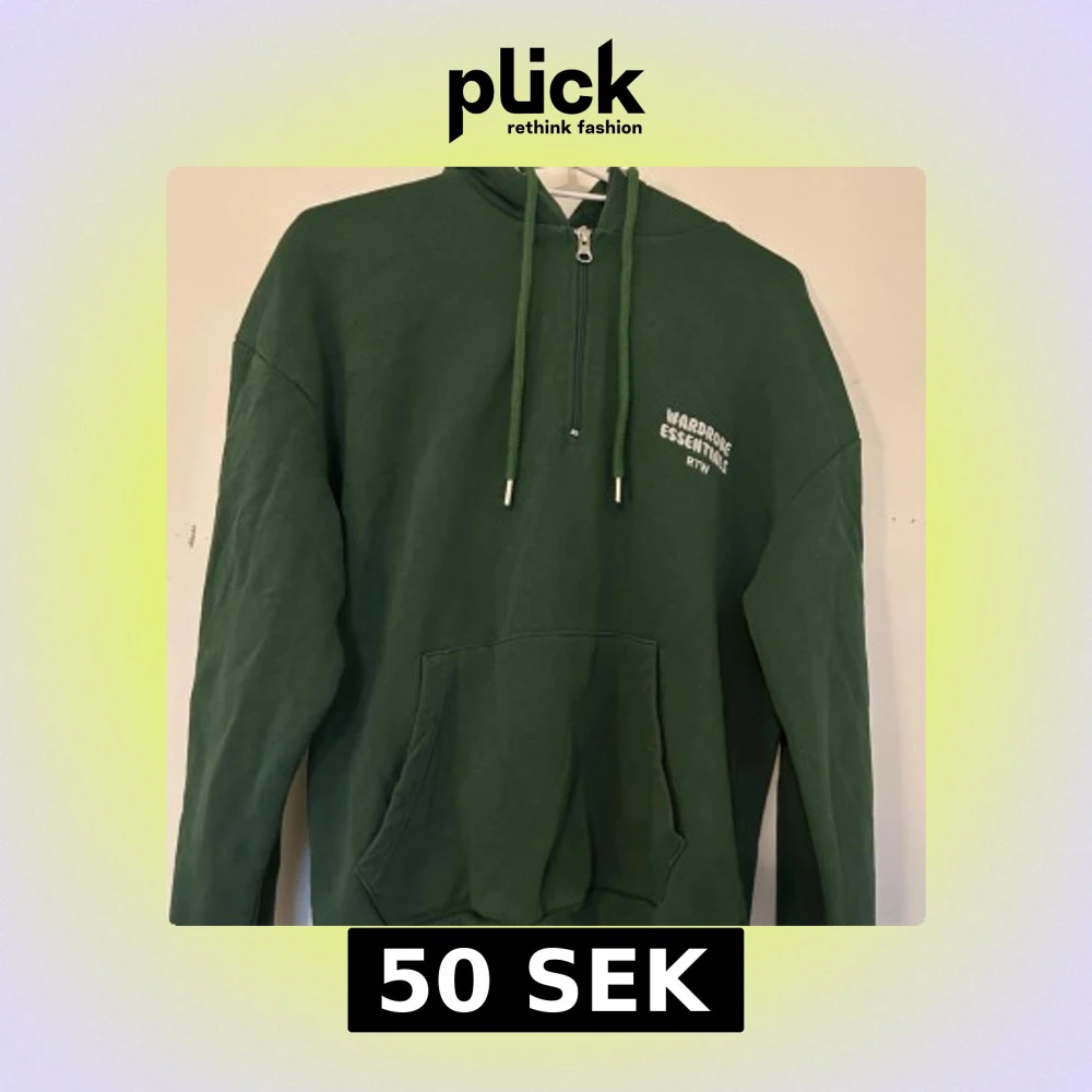 Säljer en grön hoodie från Wardrobe Essentials med dragkedja och känguruficka. Perfekt för en avslappnad stil. Den har en justerbar huva med snören och ribbade muddar vid ärmslut och nederkant.