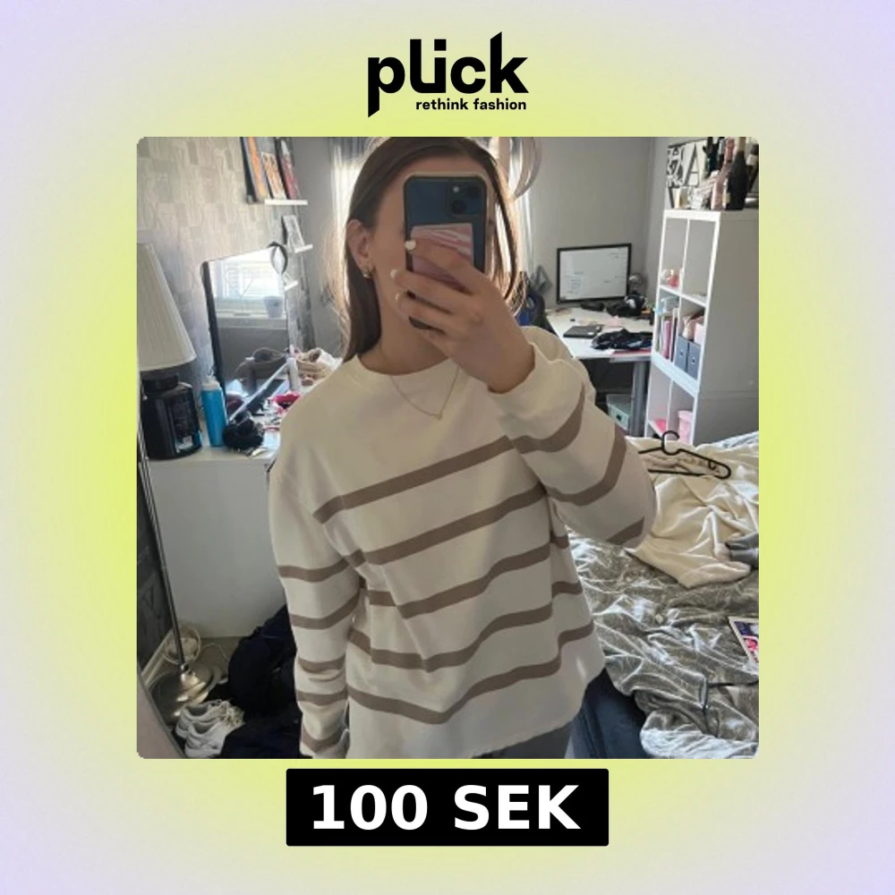 Säljer en stilren vit tröja med beigea ränder från 157. Tröjan har långa ärmar och en rund halsringning. Använd en gång 😇