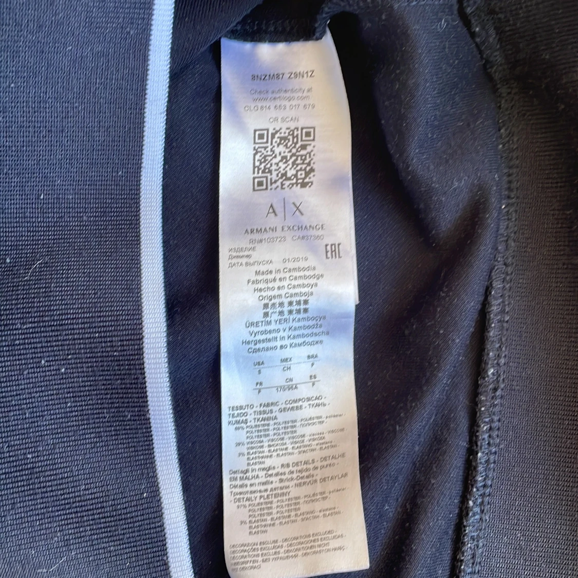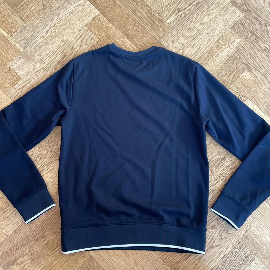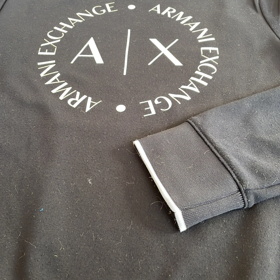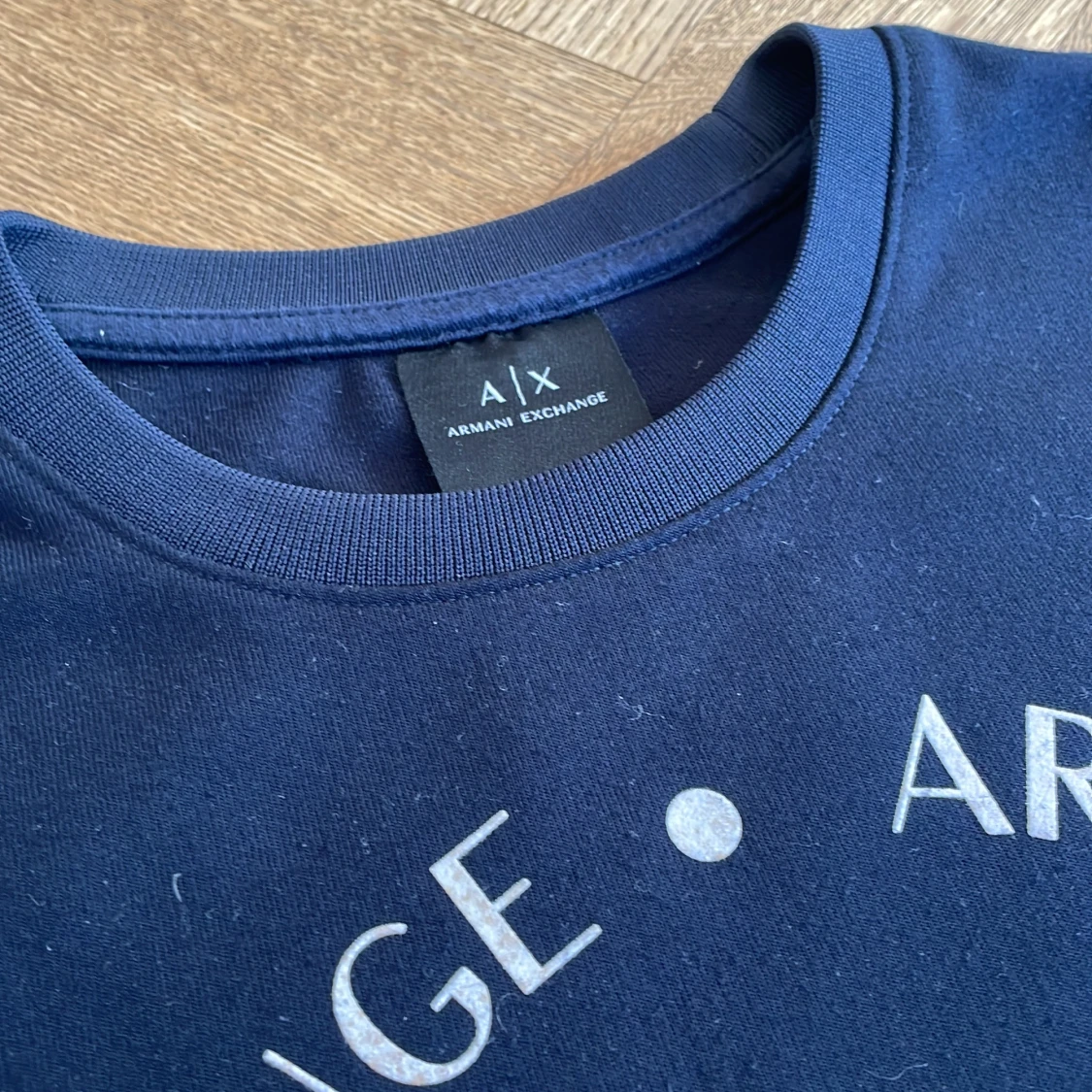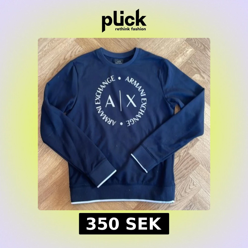 Snygg mörkblå tröja från Armani Exchange med deras ikoniska logga tryckt på framsidan. Tröjan har långa ärmar och en rund halsringning. Perfekt för en stilren och avslappnad look.