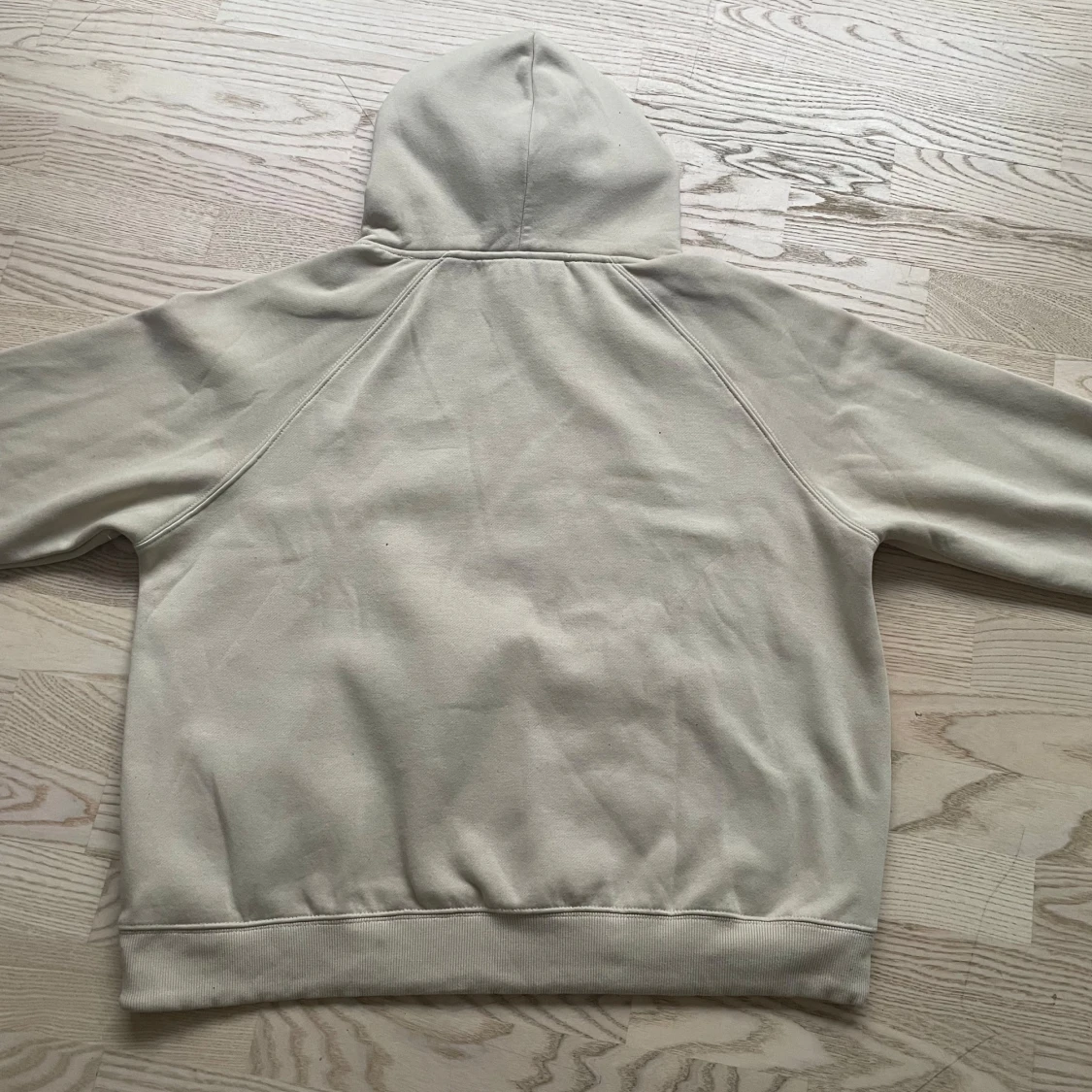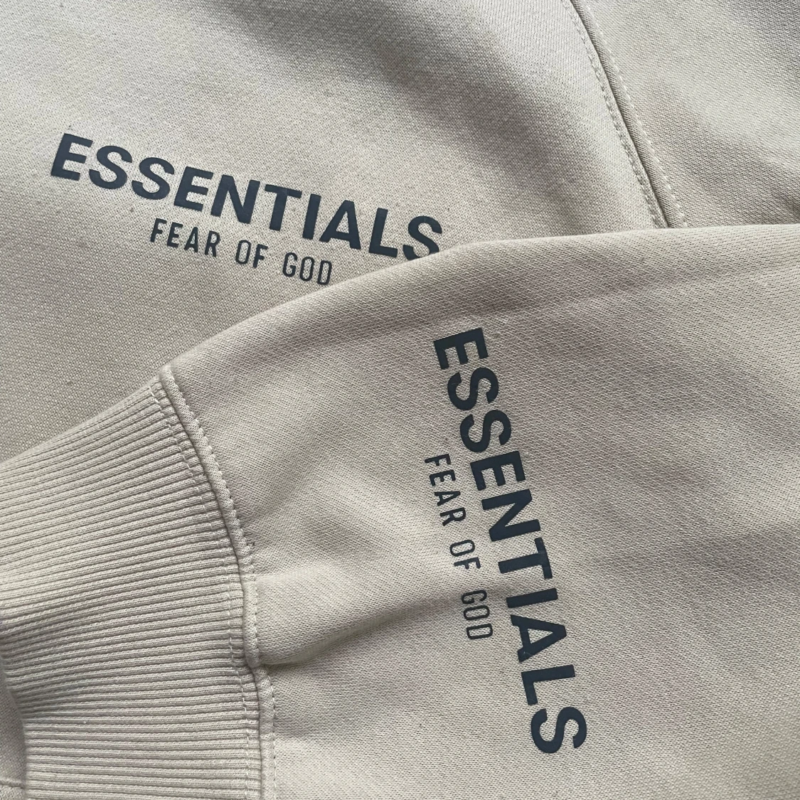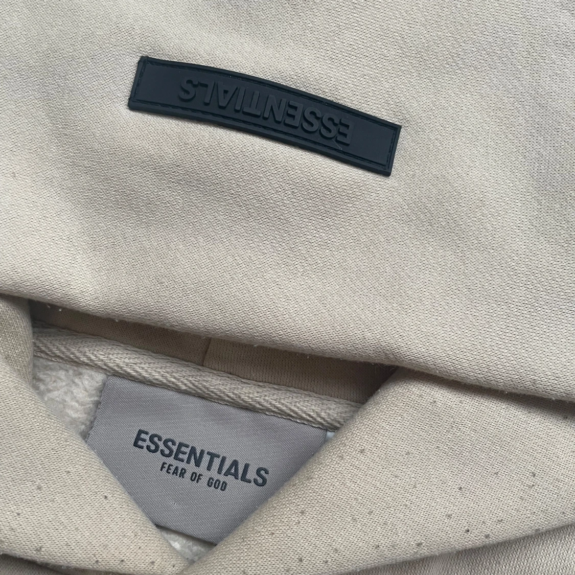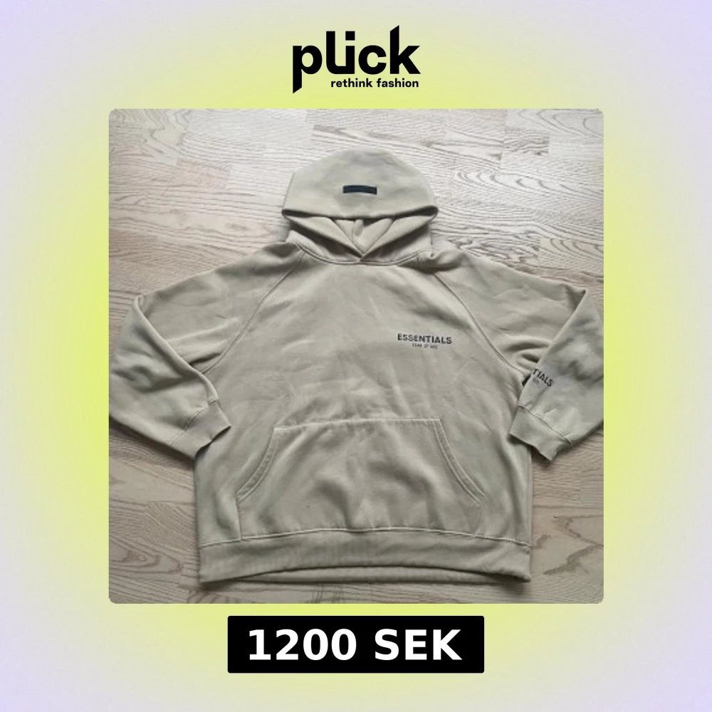 Säljer en stilren beige hoodie från Essentials Fear of God. Den har en klassisk känguruficka och ribbade muddar. Perfekt för en avslappnad stil med tryck på bröstet och ärmen.