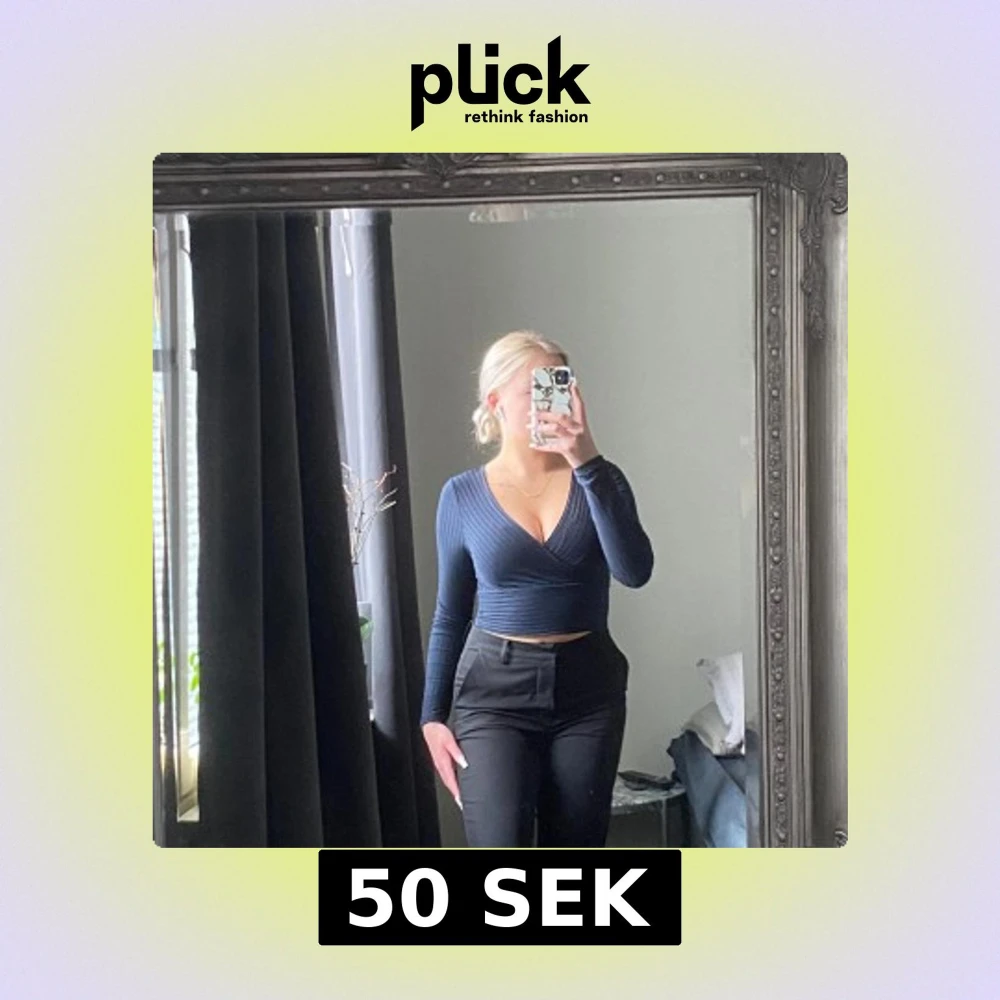 Snygg mörkblå omlottopp med ribbad struktur och v-ringad design. Toppen har långa ärmar och en croppad passform som ger en stilren look. Perfekt för att lyfta din outfit till nästa nivå.
