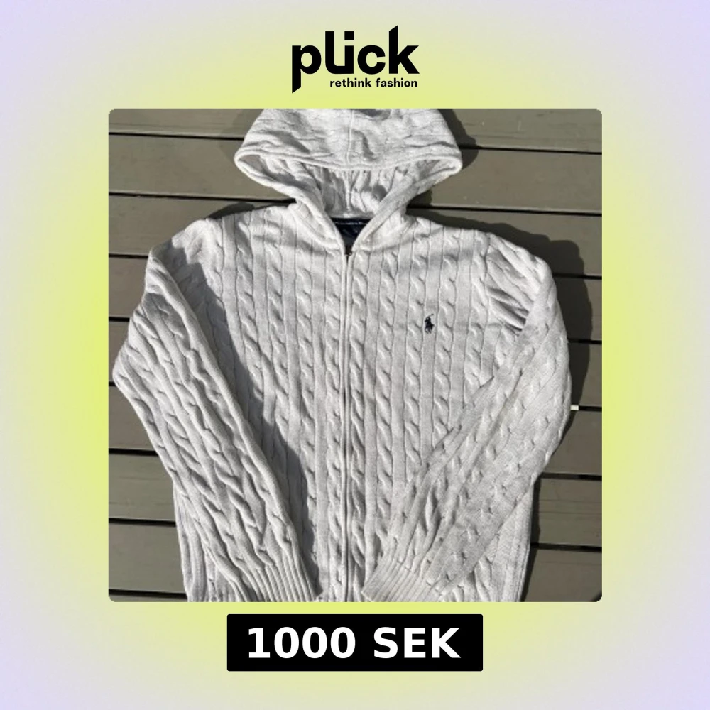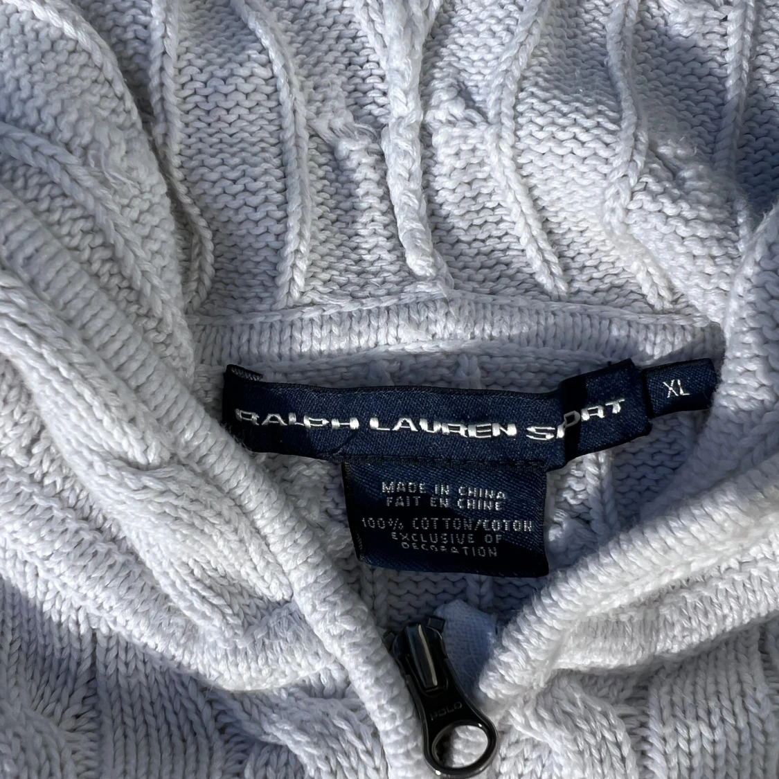 Vit kabelstickad hoodie från Ralph Lauren i bomull. Tröjan har dragkedja framtill, huva och klassisk broderad logga på bröstet. Snygg ribbad mudd vid ärmslut och nederkant. Perfekt för en chill och stilren look.