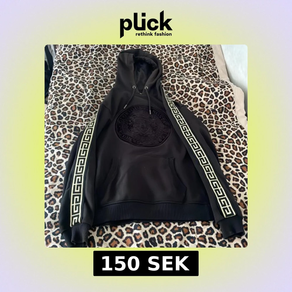 Säljer en svart,guldig hoodie från Glorious Gangsta med stora broderade detaljer på bröstet och breda, mönstrade band längs ärmarna. Tröjan har huva med dragsko och en stor magficka. Materialet är en mix av bomull och polyester.