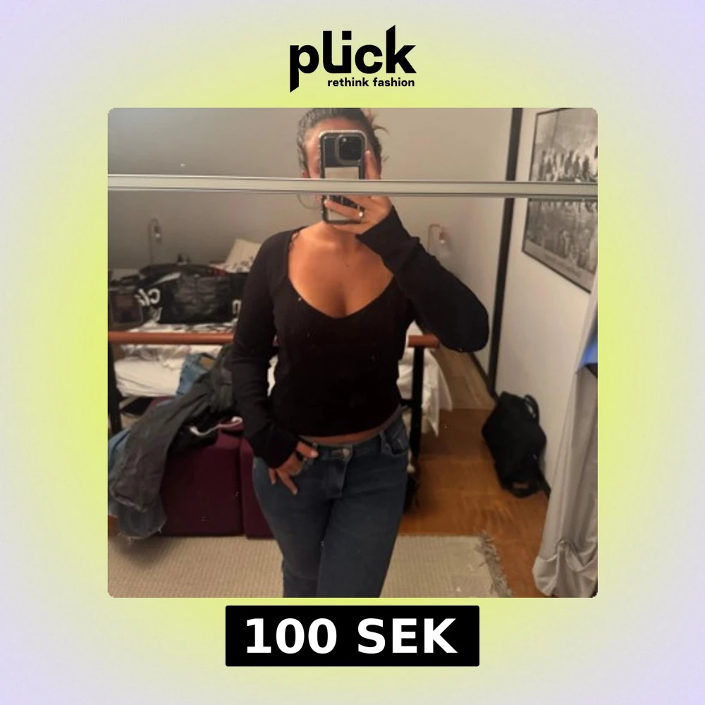 Säljer en svart tröja med v-ringning och långa ärmar. Tröjan är ribbad och sitter tajt, perfekt att styla med jeans eller kjol. Enkel och stilren design som passar till många olika looks.