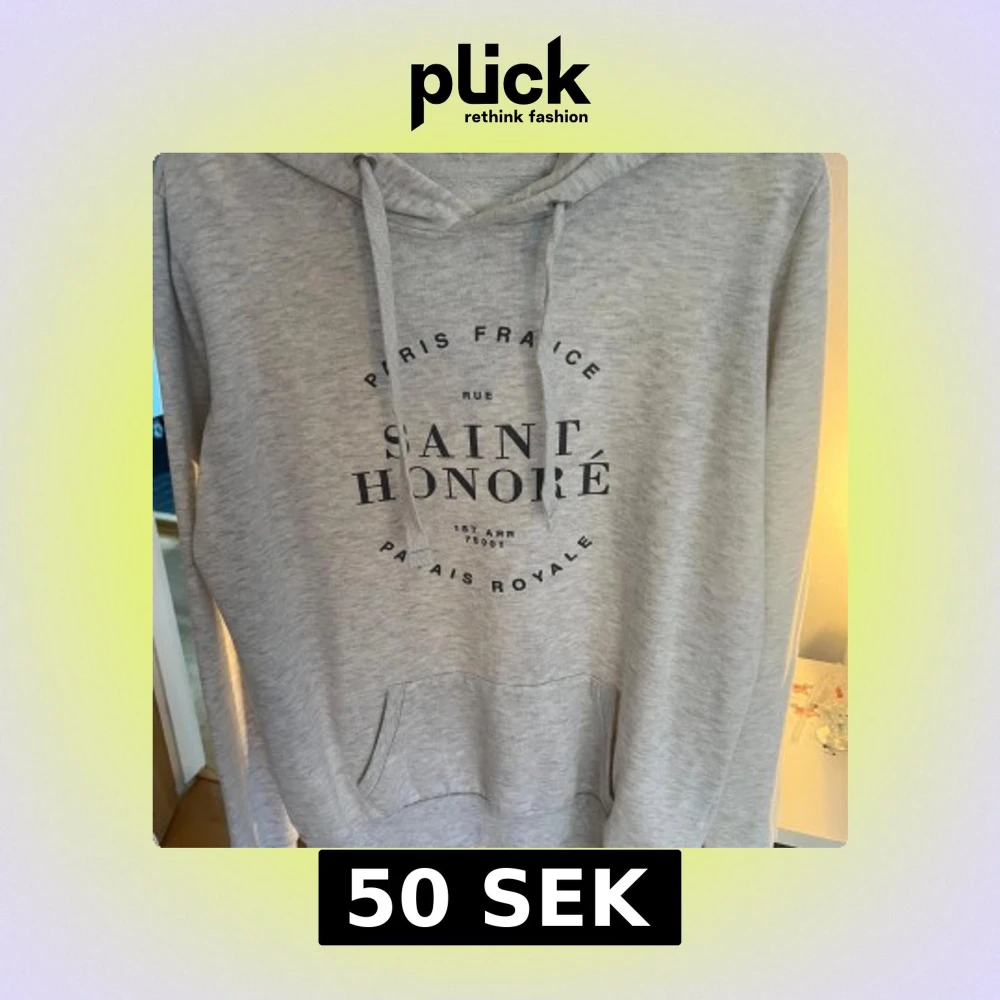 Säljer en ljusgrå hoodie från Cotton On med tryck 'Saint Honoré Paris France' på bröstet. Tröjan har huva med snörning, magficka och långa ärmar. Perfekt för chill dagar och enkel att matcha med jeans eller joggers.