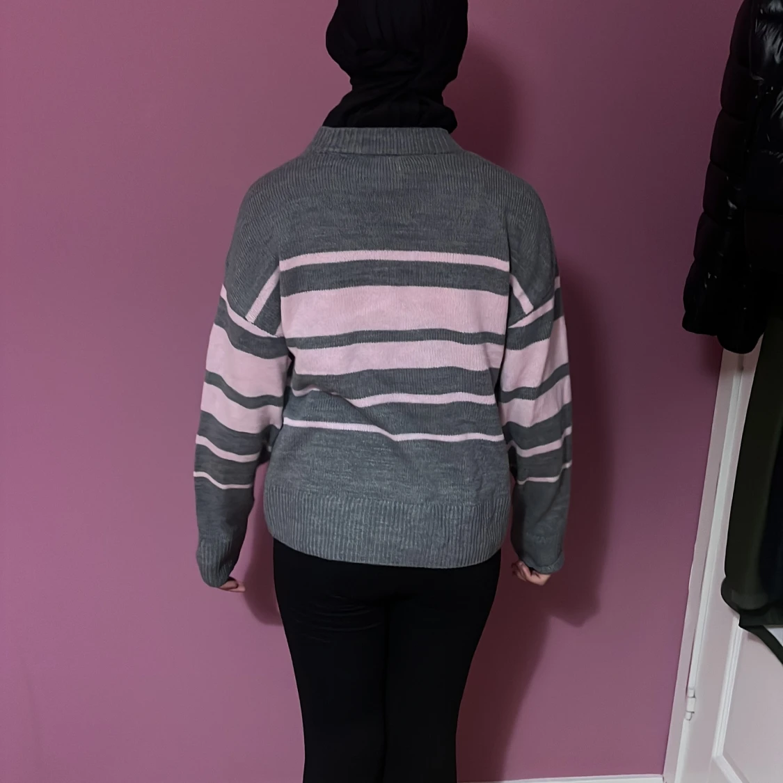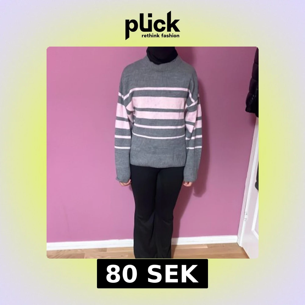 Säljer en mysig stickad tröja i grått med breda och smala rosa ränder. Tröjan har en rund hals, långärmade ärmar och ribbade muddar vid ärmslut och nederkant. Perfekt för dig som gillar chill och stilren look.