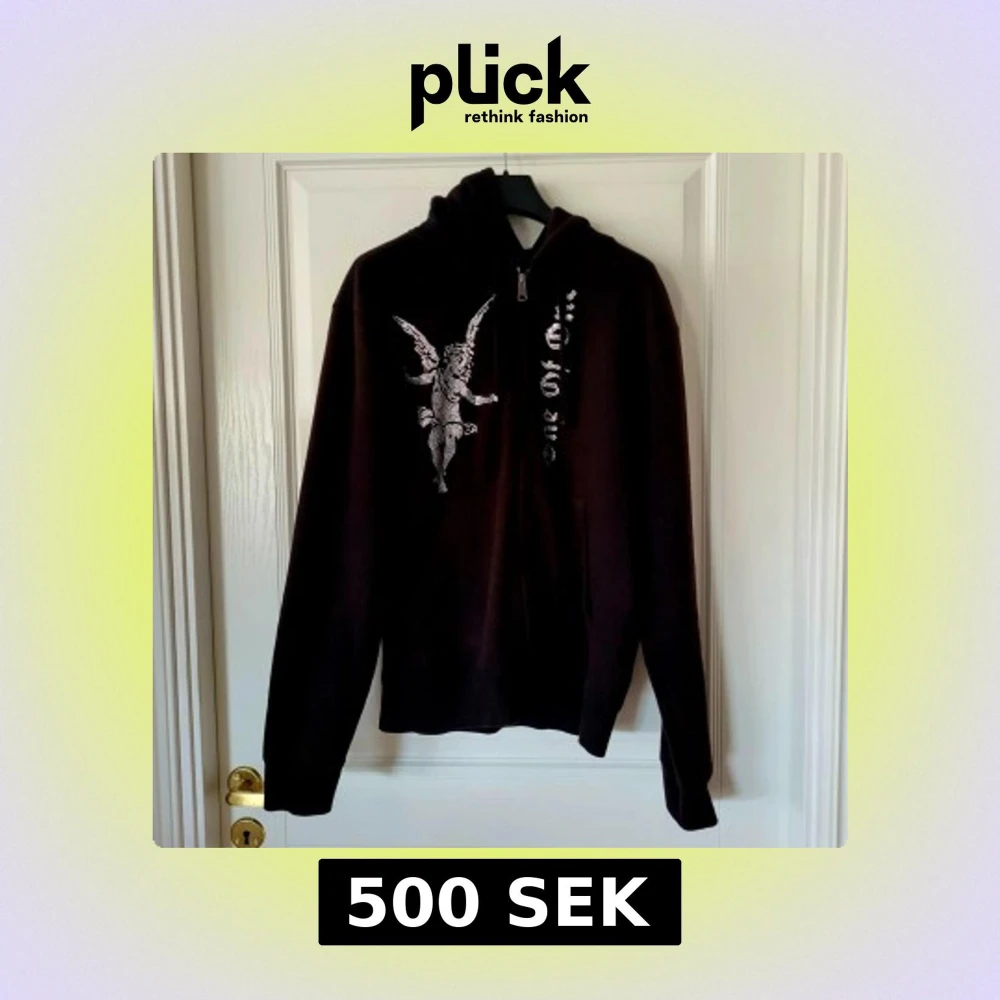Säljer en svart hoodie från One of One med ett unikt tryck av en ängel på framsidan. Tröjan har en dragkedja vid halsen och långa ärmar. Perfekt för vintern