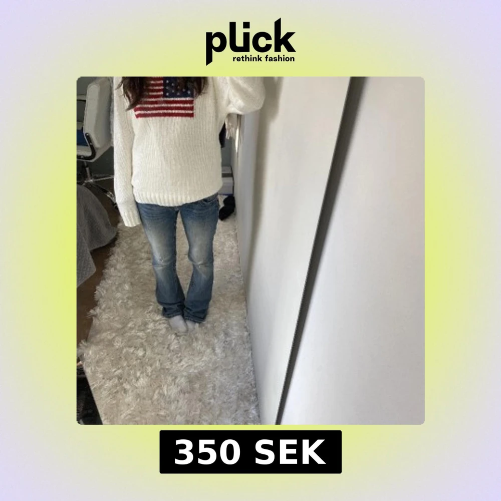 Säljer en vit stickad tröja med en stor amerikansk flagga på bröstet. Tröjan har långa ärmar och en avslappnad passform, perfekt för kyliga dagar. Den är både stilren och bekväm.