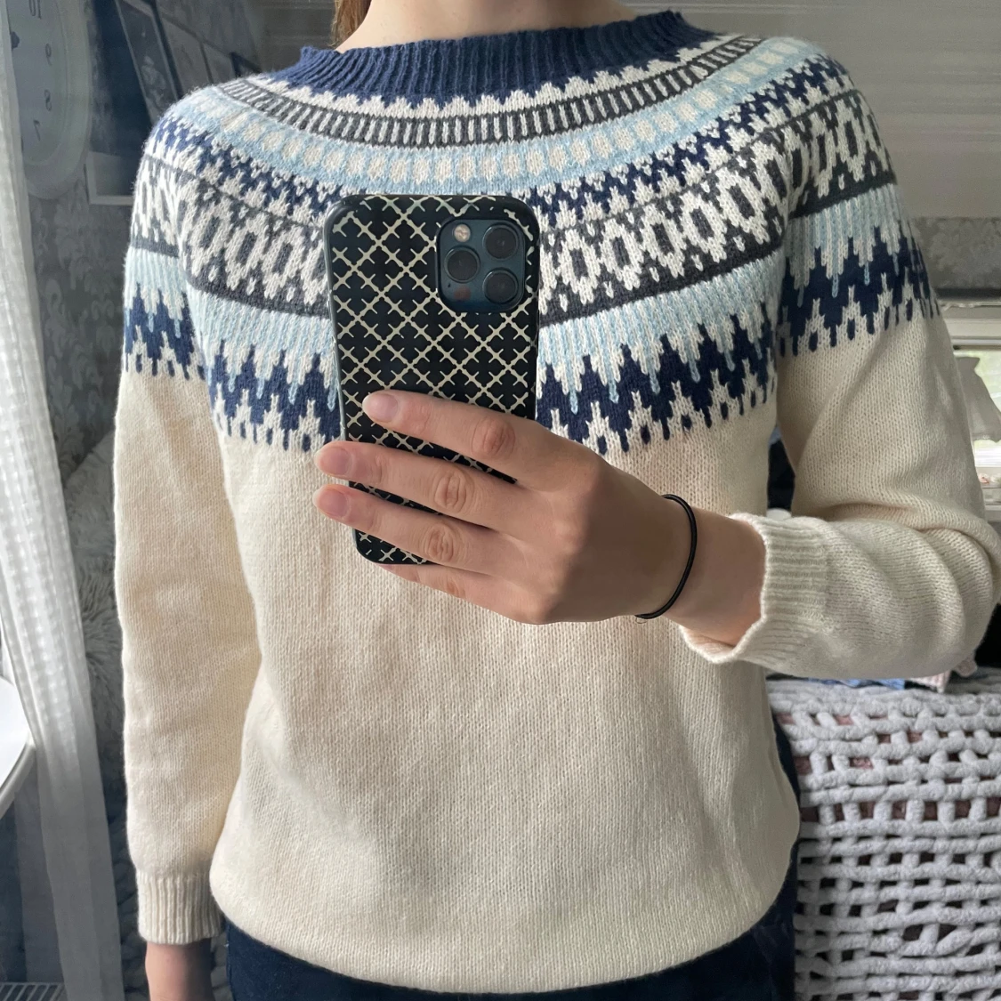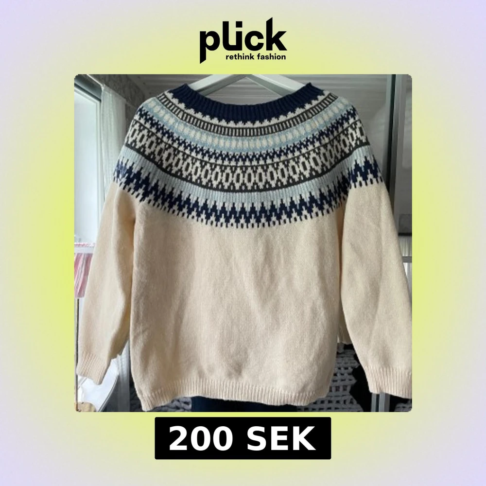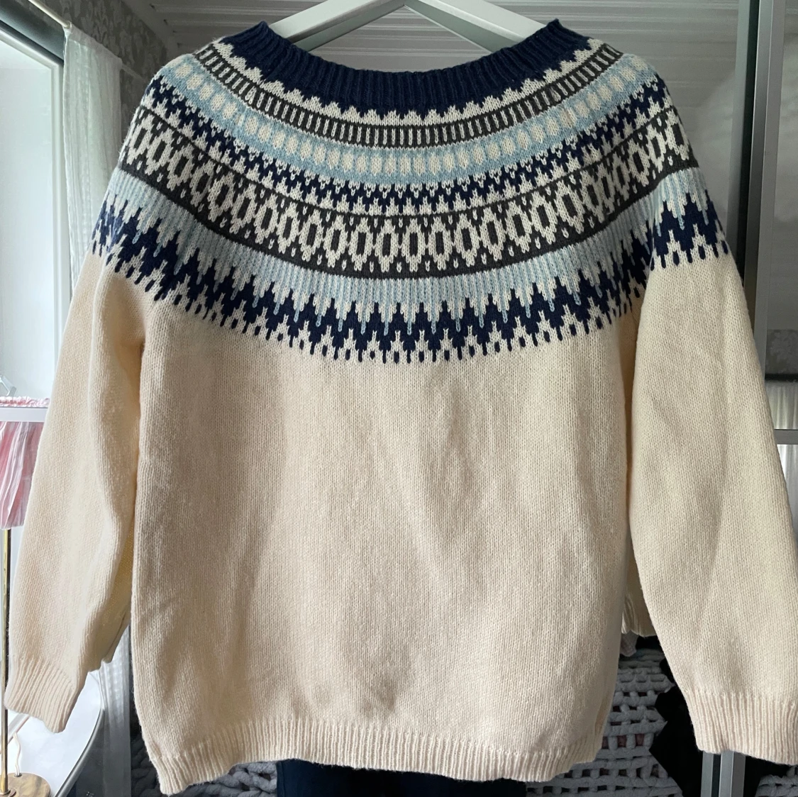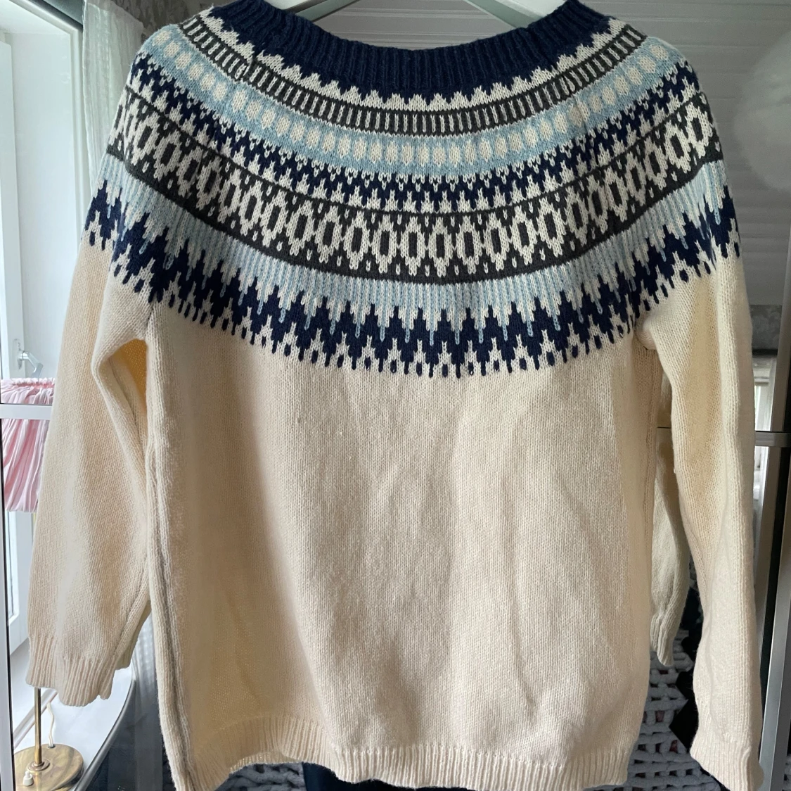 Säljer en mysig stickad tröja med klassiskt mönster i marinblått, ljusblått, vitt och grått. Tröjan har rund halsringning och ribbade muddar. Använd fåtal gånger, mycket bra skick.