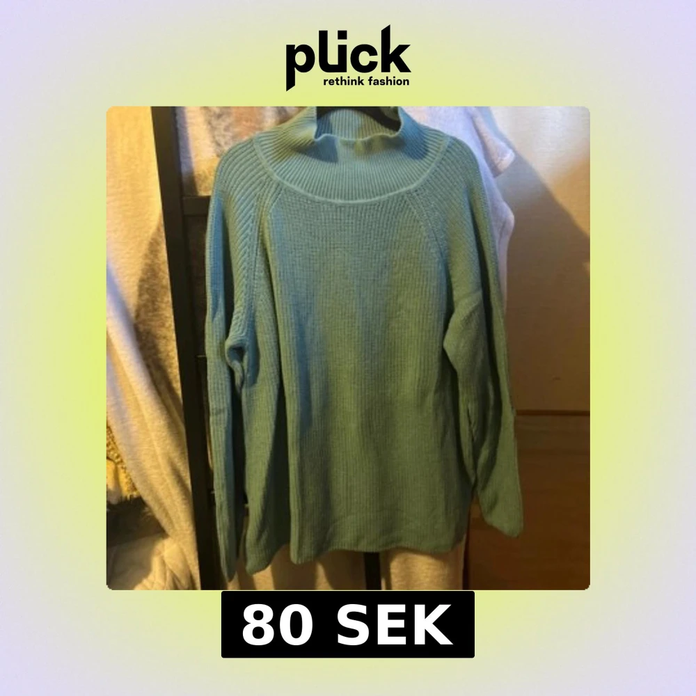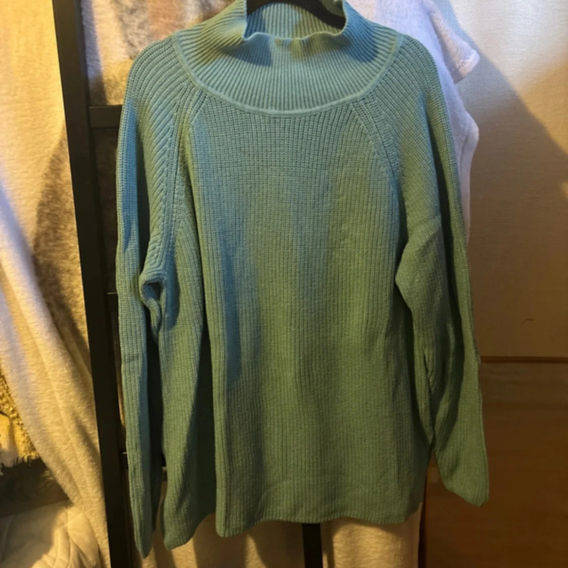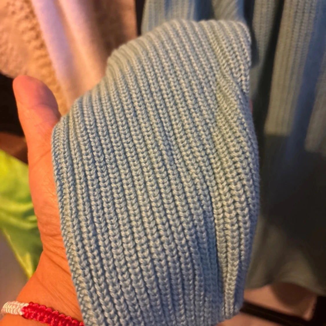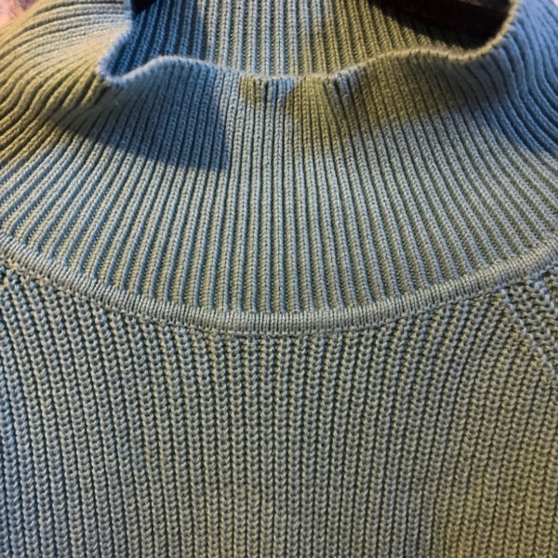 Mysig ljusblå stickad polotröja med bred ribbad krage och långärmad modell. Tröjan har en relaxed passform och är perfekt för kyliga dagar. Materialet är grovstickat och känns mjukt mot huden. Enkel att matcha med jeans eller kjol.