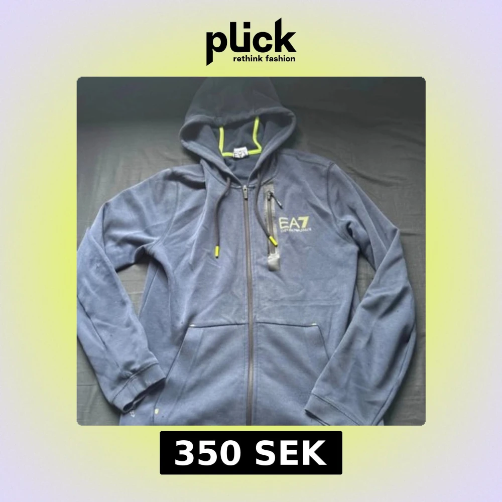 Säljer en marinblå hoodie från EA7 Emporio Armani med gul logga på bröstet och detaljer i gult. Tröjan har huva med snörning, hel dragkedja och en extra ficka med dragkedja på bröstet. Perfekt för chill eller träning.