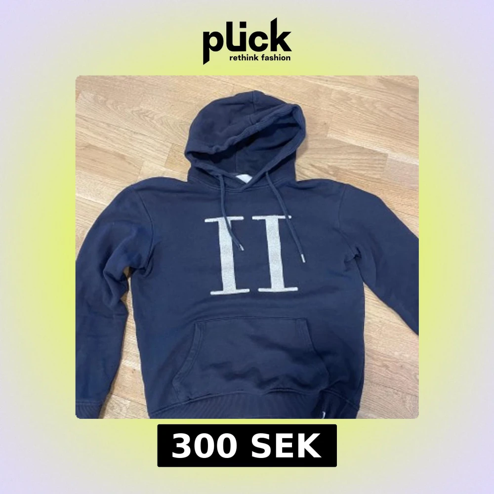Snygg mörkblå hoodie med stort vitt tryck på framsidan. Den har en klassisk känguruficka och justerbar huva med dragsko. Perfekt för en avslappnad stil.