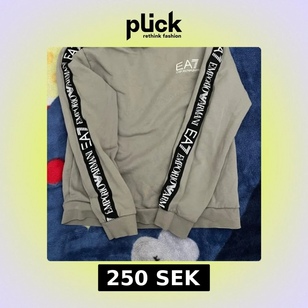Säljer en beige hoodie från Emporio Armani med långa ärmar och svarta band med logotyp längs ärmarna. Perfekt för en stilren och bekväm look.