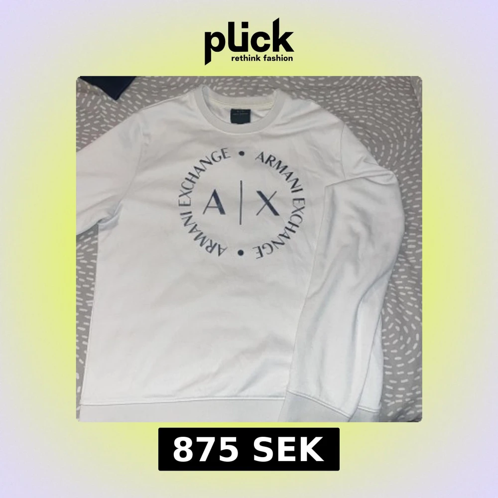 Säljer en stilren vit tröja från Armani Exchange med deras ikoniska logga tryckt på framsidan. Tröjan har långa ärmar och ribbade muddar vid ärmslut och nederkant. Perfekt för en avslappnad look.