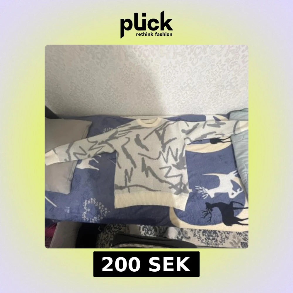 Säljer en vit och grå stickad tröja med abstrakt mönster. Tröjan har långa ärmar och en rund halsringning. Perfekt för kyligare dagar.