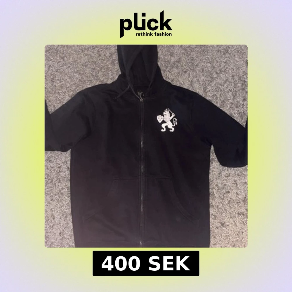 Svart hoodie med dragkedja och huva från 7H. På bröstet finns ett vitt tryck av ett lejon med sköld och svärd. Tröjan har fickor framtill och snörning i huvan. Perfekt för dig som gillar stilrena och coola detaljer.