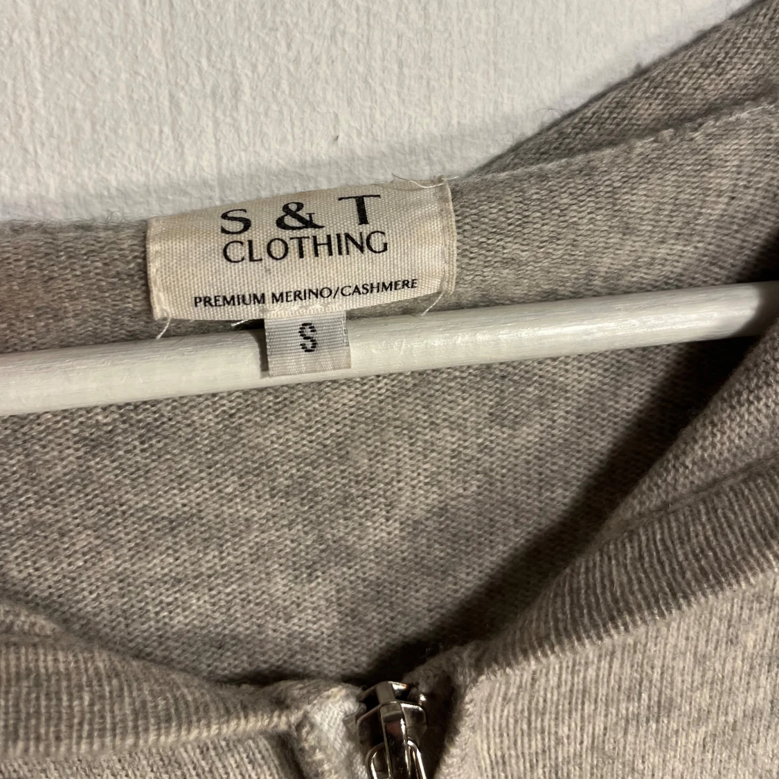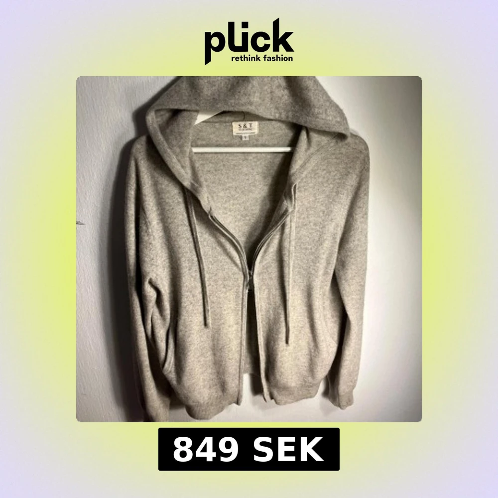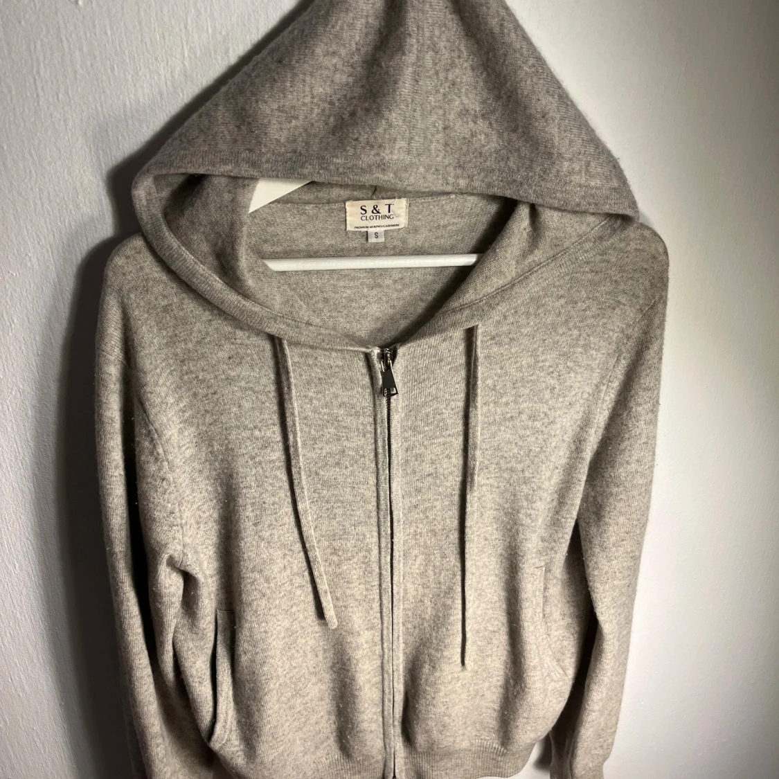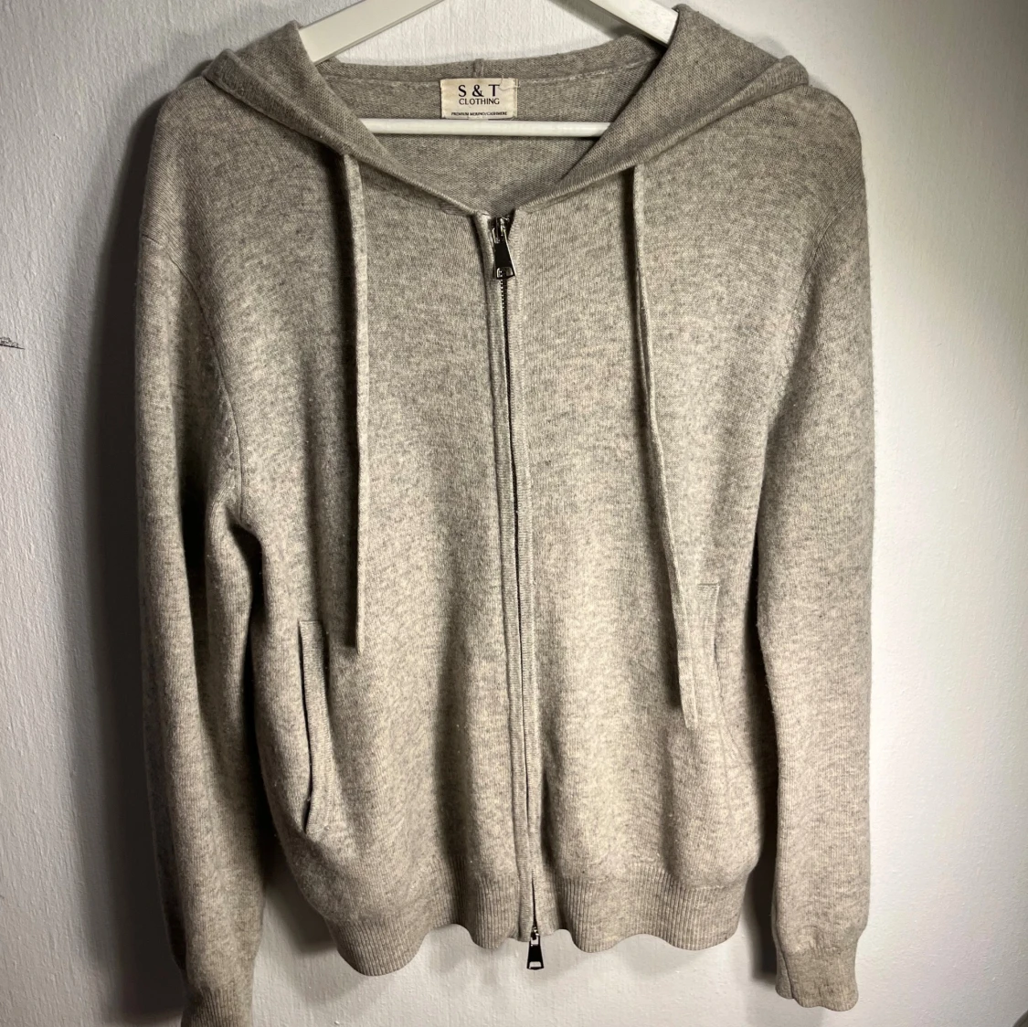 Ljusgrå hoodie från S&T Clothing i en lyxig blandning av merinoull och kashmir. Tröjan har två dragkedjor framtill, huva med snörning. Nypris på över 2000kr. Väldigt bra skick men ändå lite tecken på användning som knappt märks