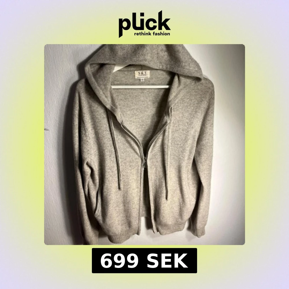 Ljusgrå hoodie från S&T Clothing i en lyxig blandning av merinoull och kashmir. Tröjan har två dragkedjor framtill, huva med snörning. Nypris på över 2000kr. Väldigt bra skick men ändå lite tecken på användning som knappt märks, sytt ihop ett pyttelitet hål som knappt syns längre(se sista bilden).