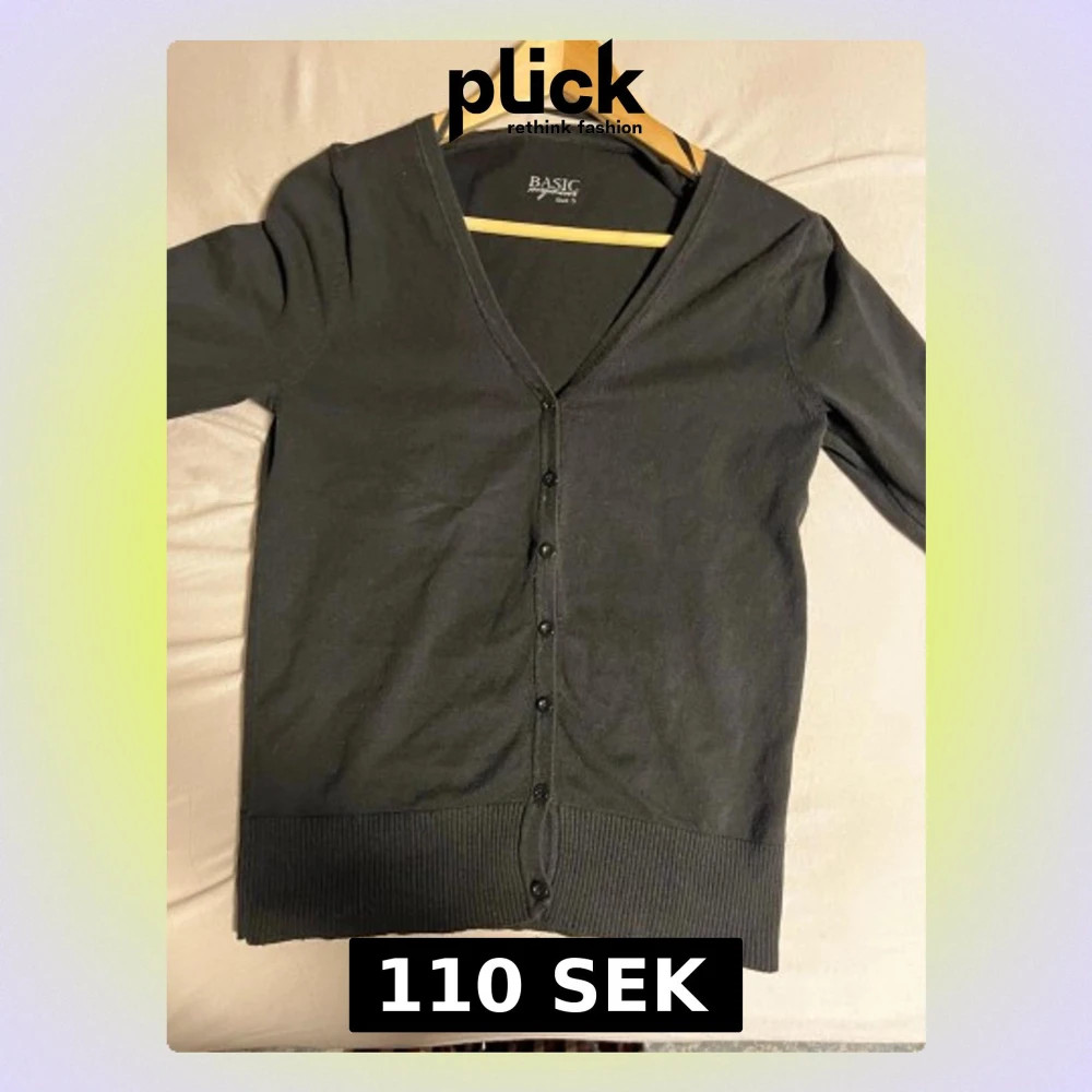 En enkel svart kofta från BASIC med v-ringning och knäppning framtill. Koftan har långa ärmar och breda ribbade muddar vid ärmslut och nederkant. Perfekt att slänga över en t-shirt eller linne för en clean look.