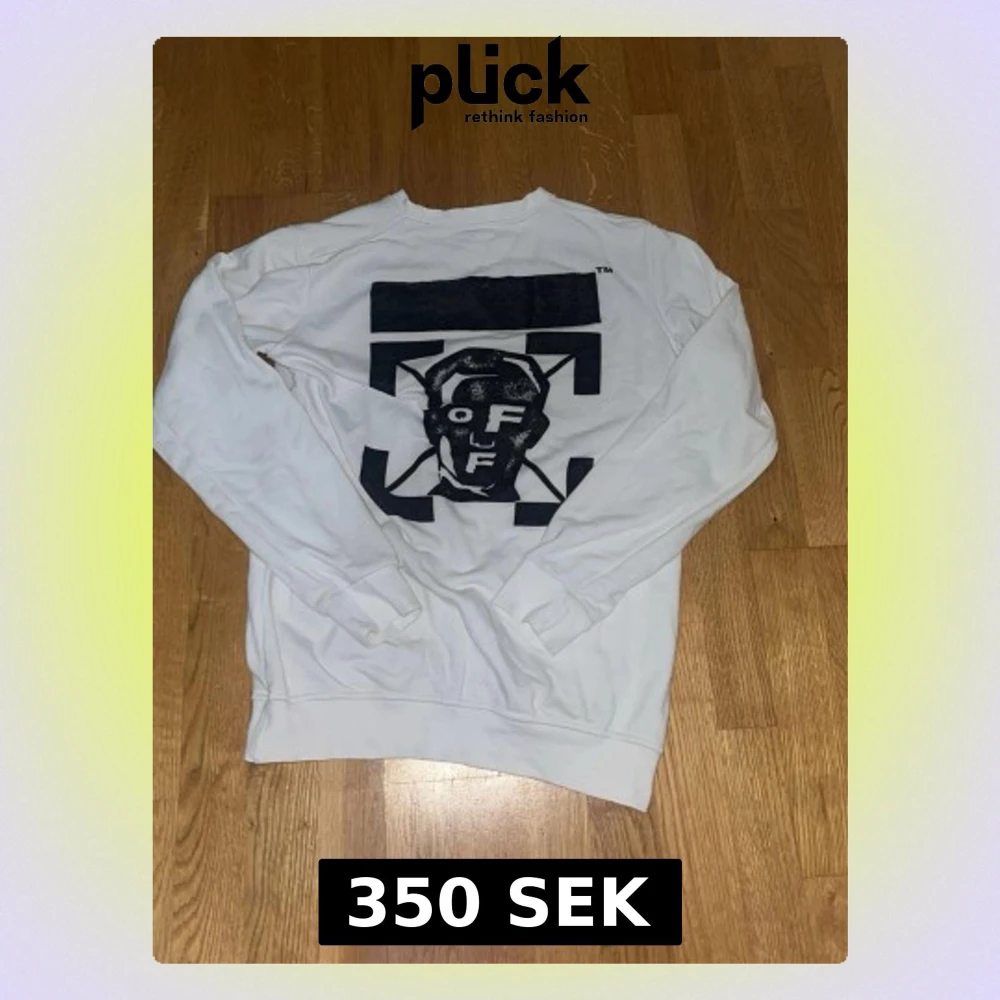 Säljer en clean vit sweatshirt från Off-White med svart grafiskt tryck på ryggen och liten logga framtill. Tröjan har rund hals, långa ärmar och är gjord i mjuk bomull. Perfekt för dig som gillar streetwear och vill sticka ut lite extra.