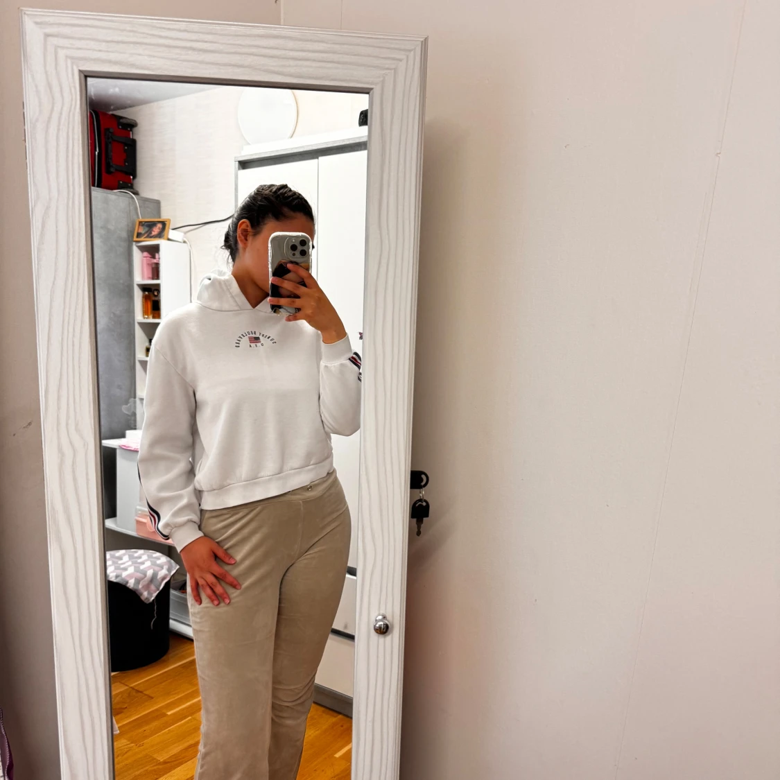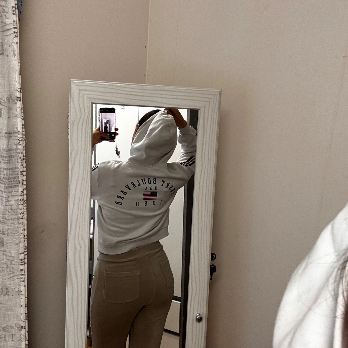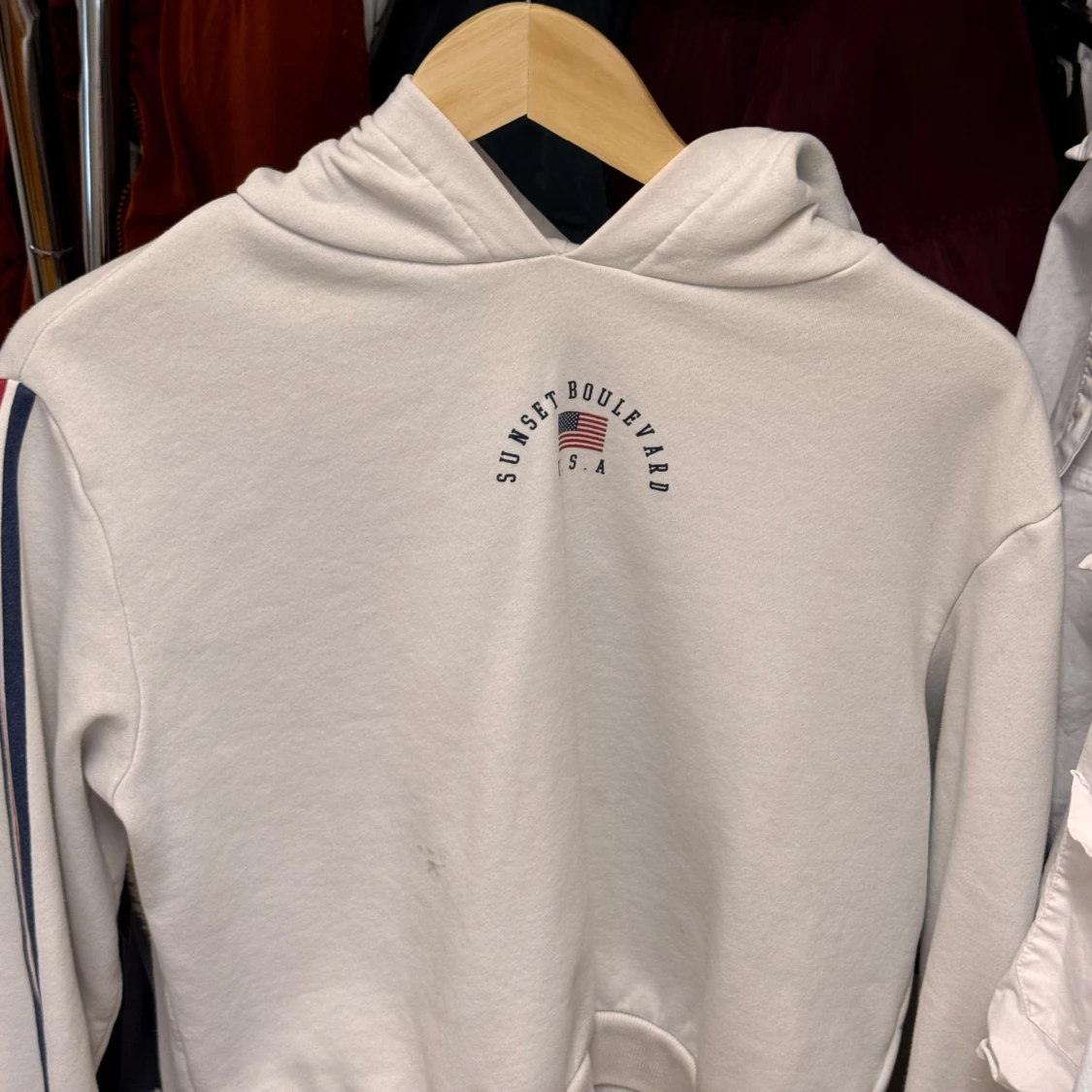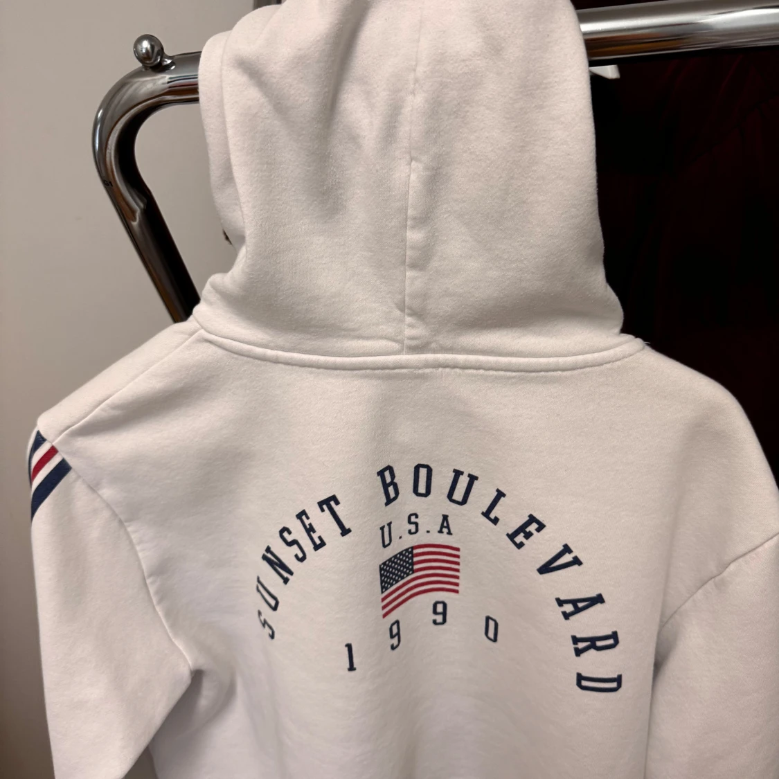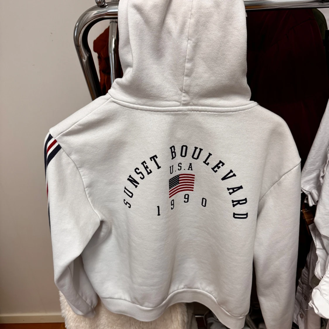 Vit hoodie med tryck 'Sunset Boulevard U.S.A 1990' och amerikansk flagga på ryggen. Snygga ränder i blått och rött på ärmarna. Croppad passform och huva. Perfekt för chill dagar och streetstyle. Mjuk och skön i bomullsmix.