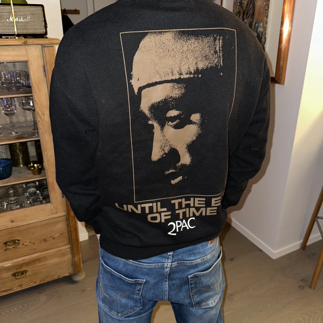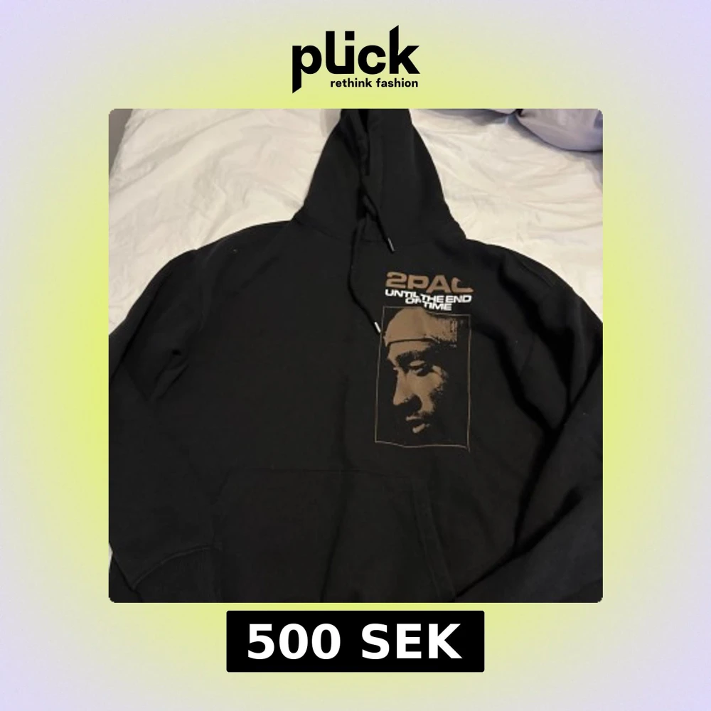Svart hoodie med 2PAC-tryck, storlek S men är stor i storleken så den passar även M