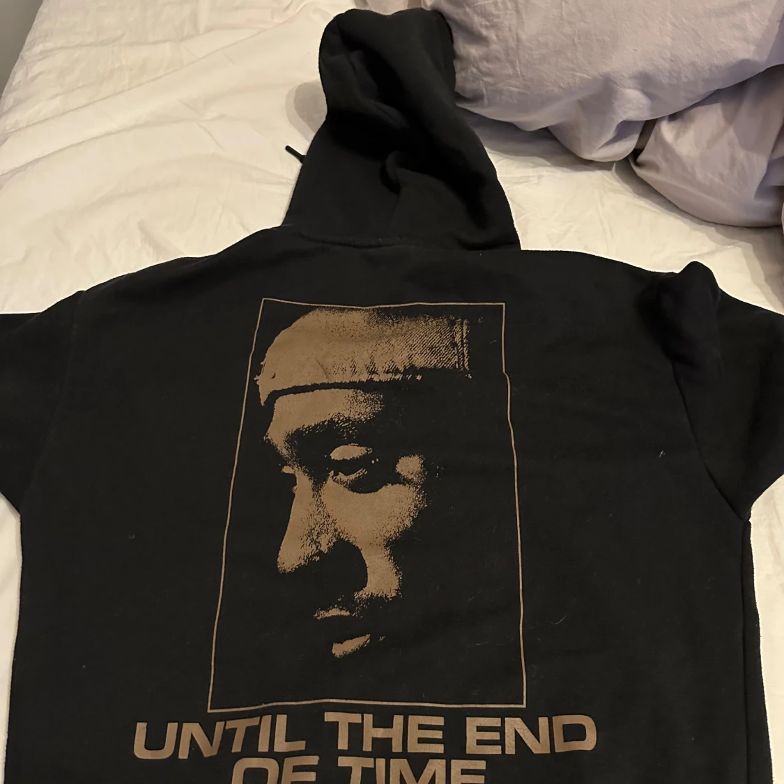 Säljer en svart hoodie med stort 2PAC-tryck både fram och bak.