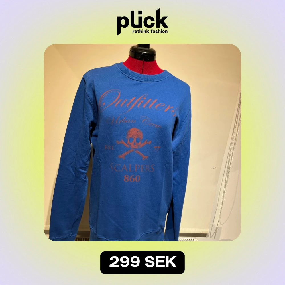 Säljer en cool blå tröja från Scalpers med tryck av en dödskalle och texten 'Outfitters Urban Crew'. Tröjan är i 100% bomull och har långa ärmar. Perfekt för en avslappnad stil. Tillverkad i Portugal.