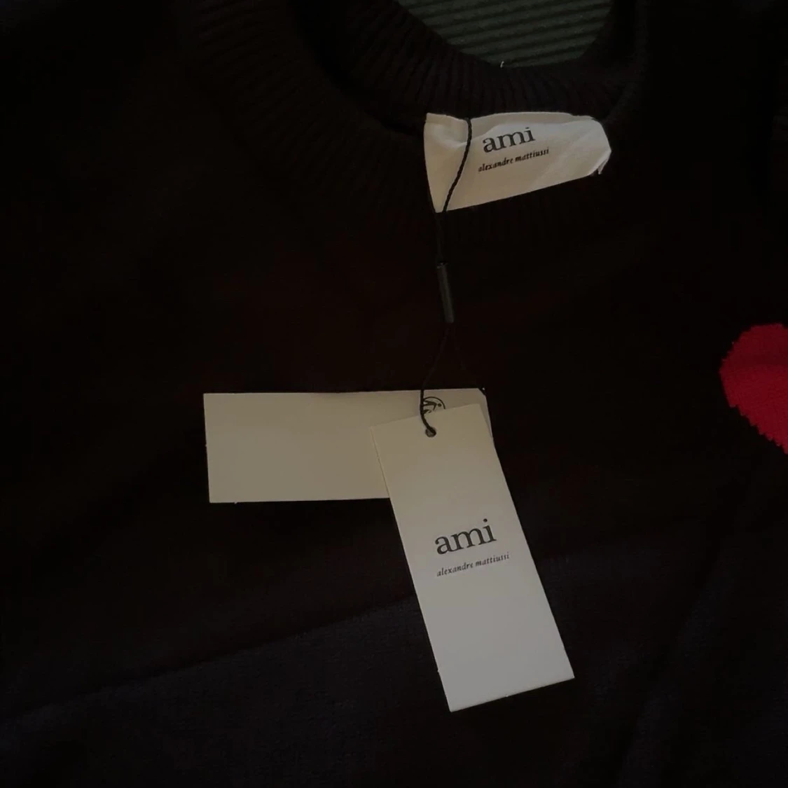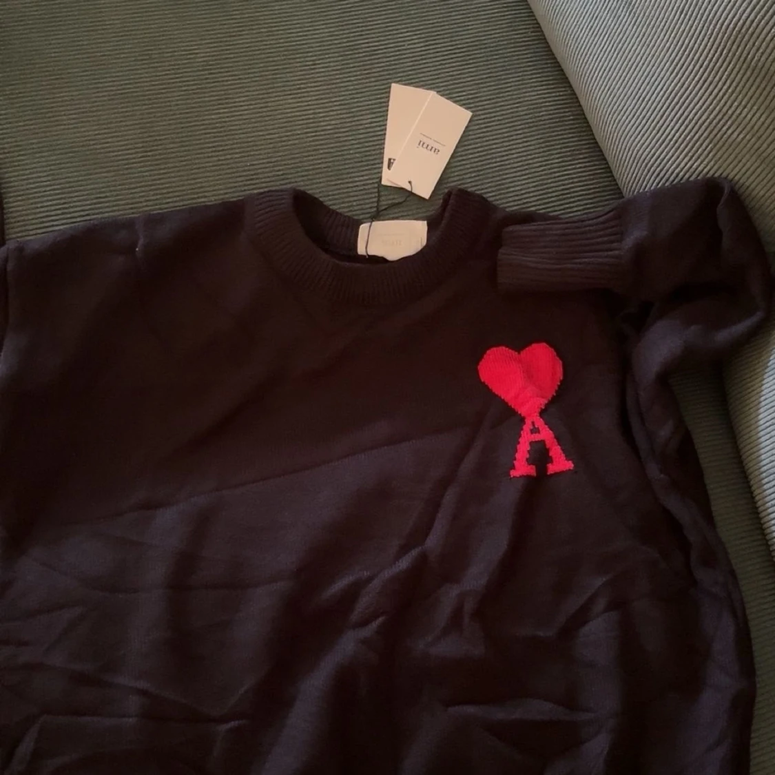 Svart stickad tröja från Ami Alexandre Mattiussi med röd hjärtapplikation och bokstaven A på bröstet. Rund hals med ribbade muddar och klassisk passform. Perfekt för dig som gillar stilrena detaljer och vill ha något som sticker ut.