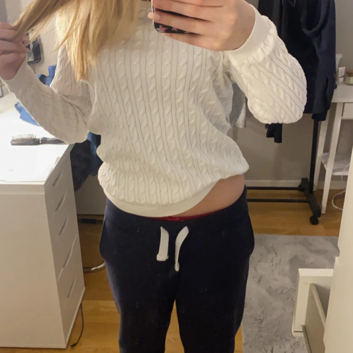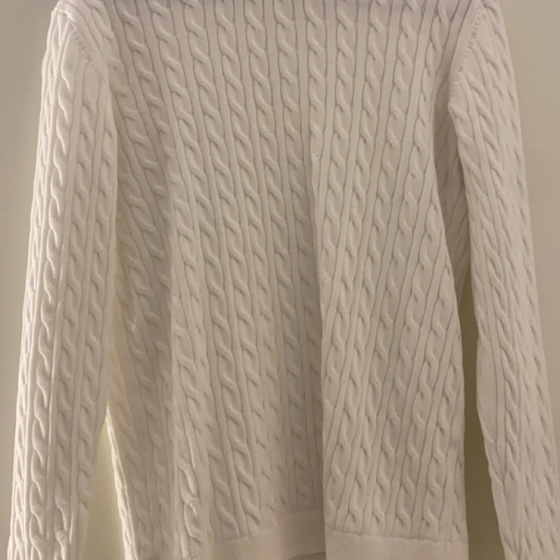 Säljer en stilren vit stickad tröja med kabelstickat mönster. Tröjan har långa ärmar och en klassisk passform som passar perfekt till allt!