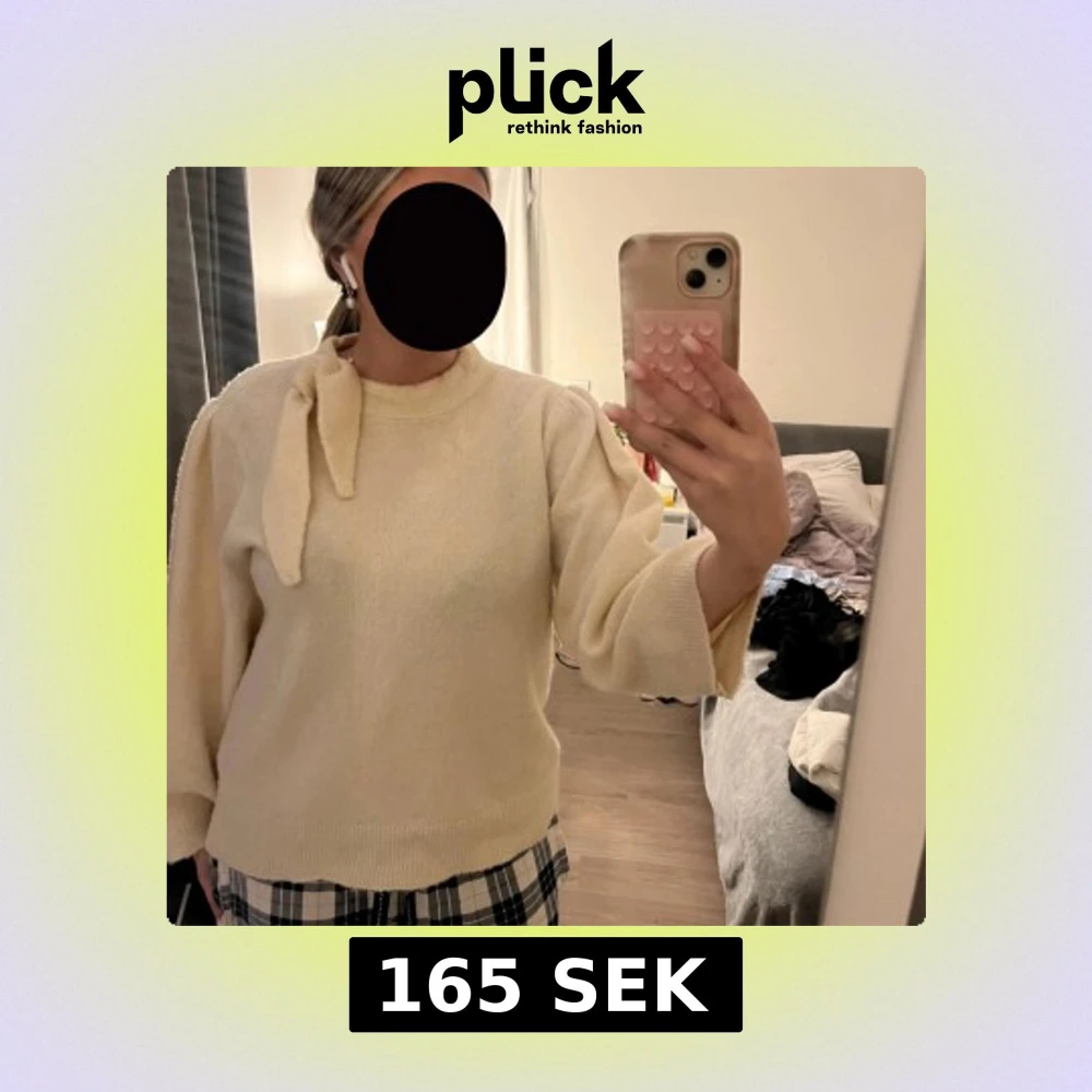 Säljer en mysig beige tröja med en unik knytdetalj vid halsen. Tröjan har långa ärmar och en avslappnad passform, perfekt för kyligare dagar. Passar bra till både jeans och kjol.