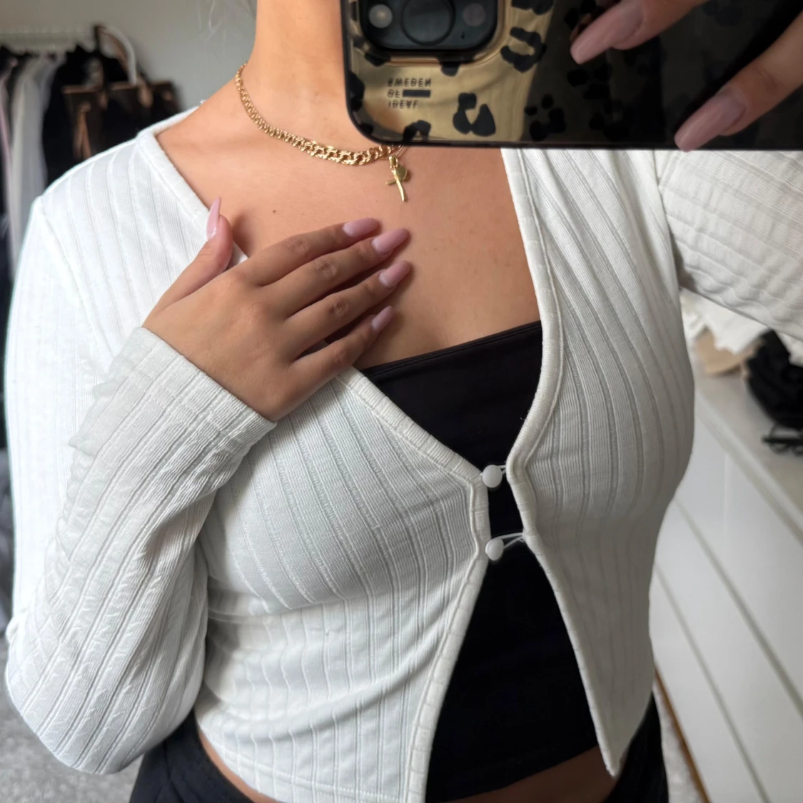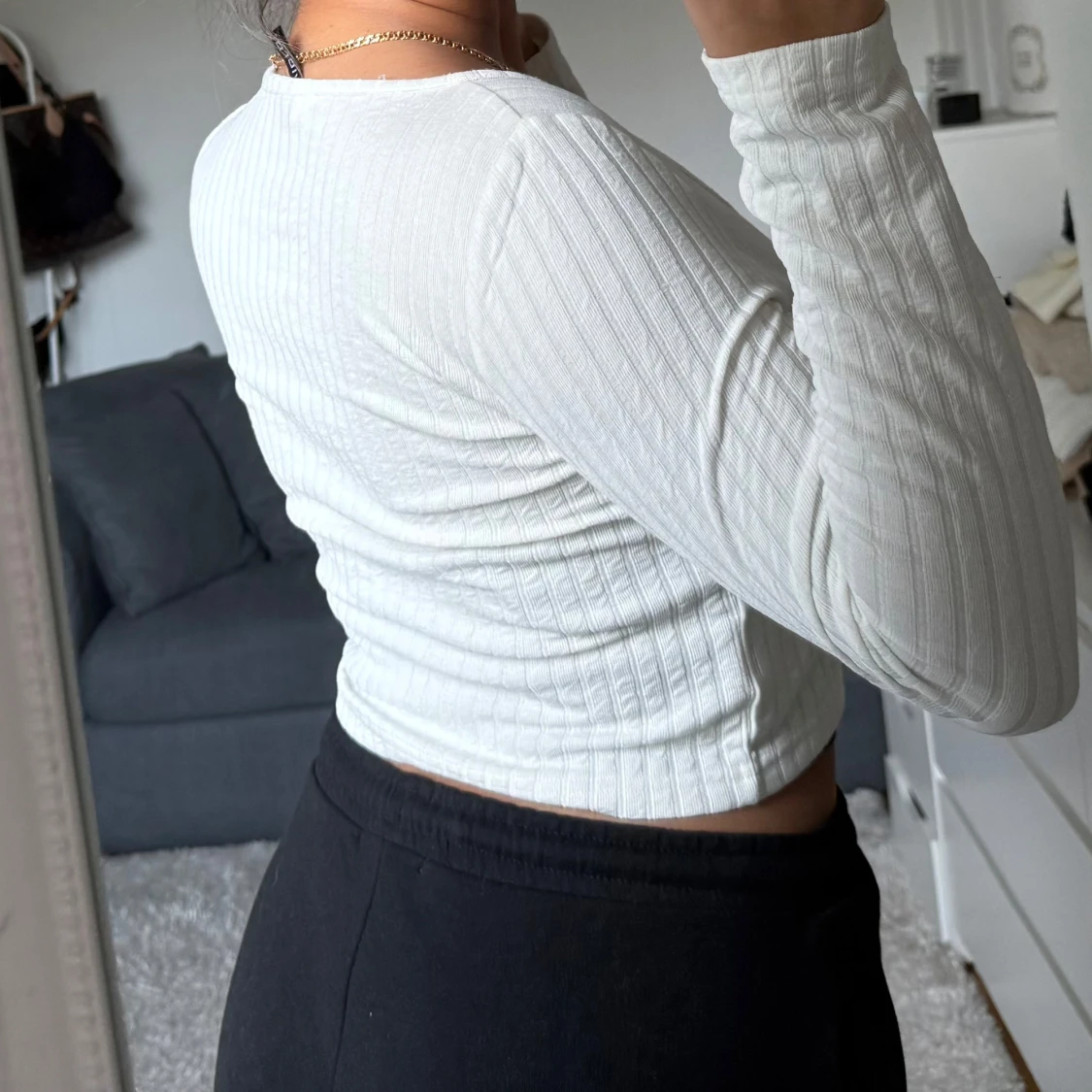 Säljer en stilren vit ribbad kofta med lång ärm och knappar framtill. Perfekt för lager-på-lager och att matcha med olika toppar. Koftan är croppad och ger en modern look.