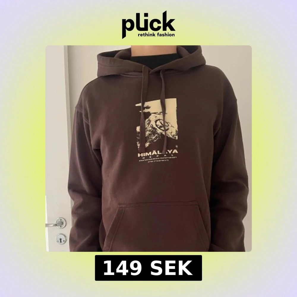 Säljer en brun hoodie med tryck av Himalaya och text på bröstet. Tröjan har huva med dragsko och en stor magficka framtill. Perfekt för en avslappnad stil.