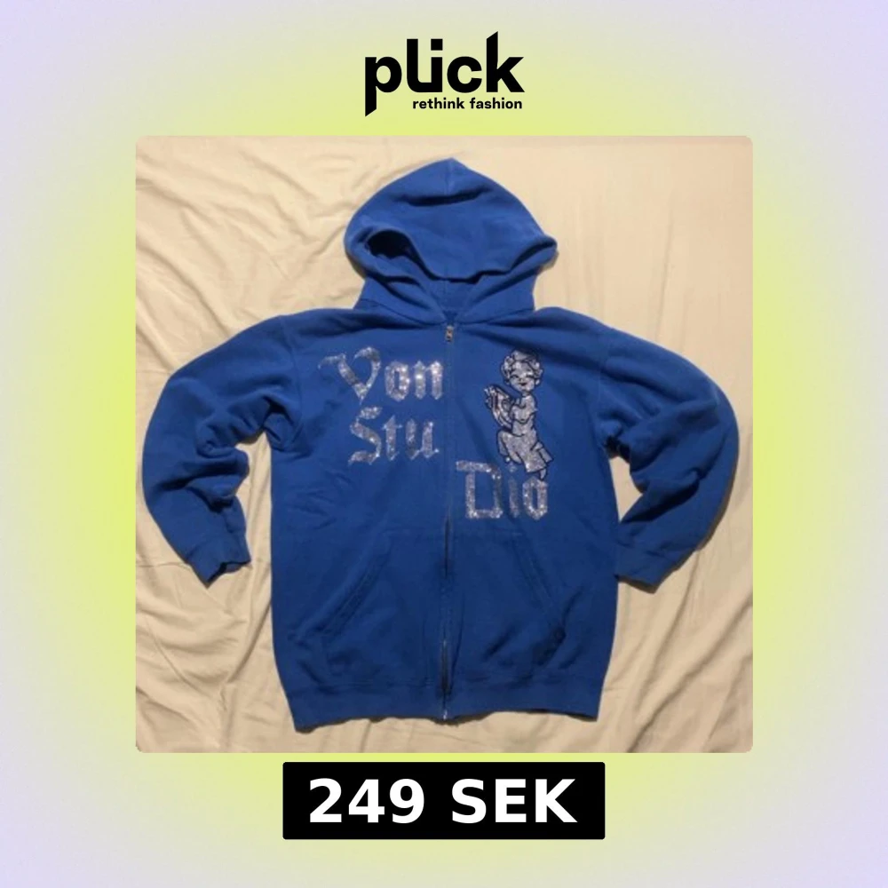 Blå hoodie från Von Studio med glittrande strassdetaljer och en stor ängel på framsidan. Dragkedja hela vägen, huva och två fickor. Perfekt statement-plagg för dig som gillar att sticka ut.