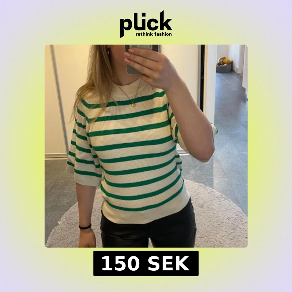 Randig tröja med gröna och vita ränder. Tröjan har trekvartsärmar och är i ett super skönt omfamnande material. Köp för 400kr, använd några gånger.