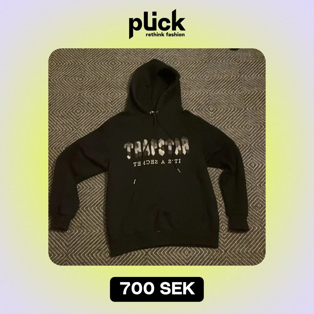 Säljer en svart hoodie från Trapstar i storlek S. Den har en cool text på framsidan och är perfekt för både höst och vinter. Hoodien är i bra skick och superbekväm att ha på sig. Perfekt för en avslappnad stil eller streetwear-look!