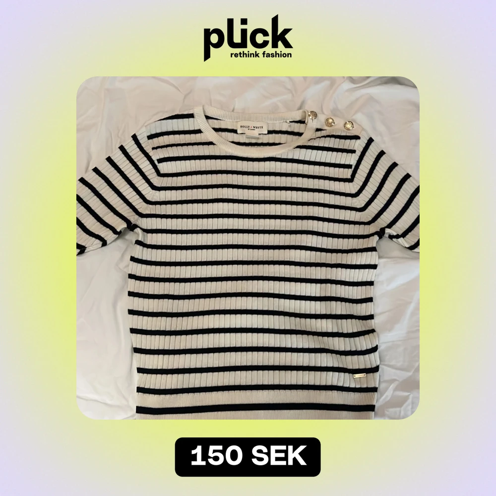 Säljer en superfin randig tröja från Holly & Whyte by Lindex i storlek S. Den är vit med svarta ränder och har snygga guldfärgade knappar på axeln. Tröjan är ribbad och har volangdetaljer vid ärmsluten. Perfekt för både vår och höst!