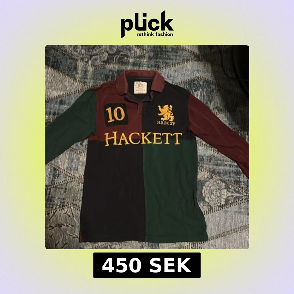 Säljer en klassisk pikétröja från Hackett med blockfärger i vinrött, mörkgrönt och marinblått. Original pris 1000kr. Stora broderade detaljer med lejon, siffran 10 och HACKETT-logga framtill. Långärmad och tillverkad i 100% bomull. Perfekt för dig som gillar sportig och preppy stil. passar både S och XS