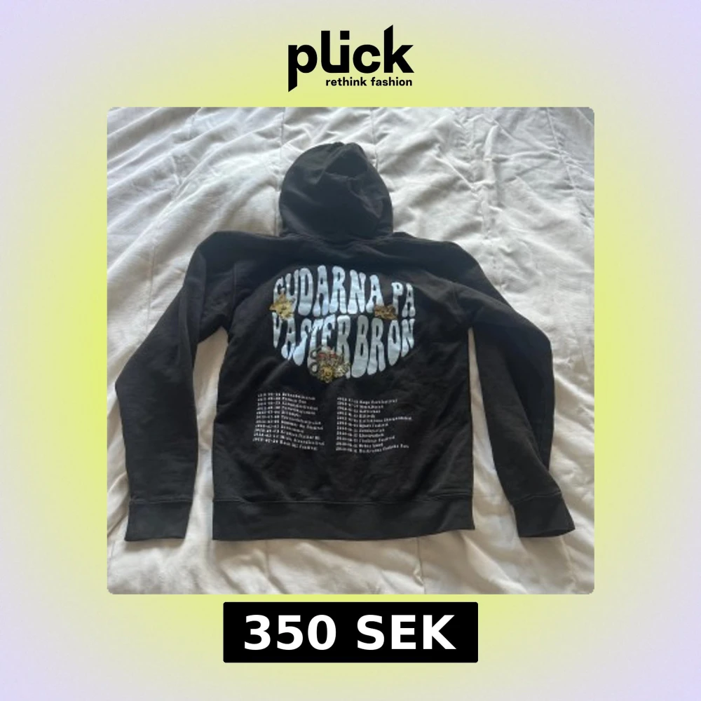 Svart hoodie med stor vit tryckt text 'Gudarnas på Västerbron' och festivalturné på ryggen. Framsidan har en liten broderad krona på bröstet. Klassisk känguruficka, snörning i huvan och mjukt bomullsmaterial. Perfekt för dig som gillar hov1.💕 är en storlek S men skulle säga mer som xs.