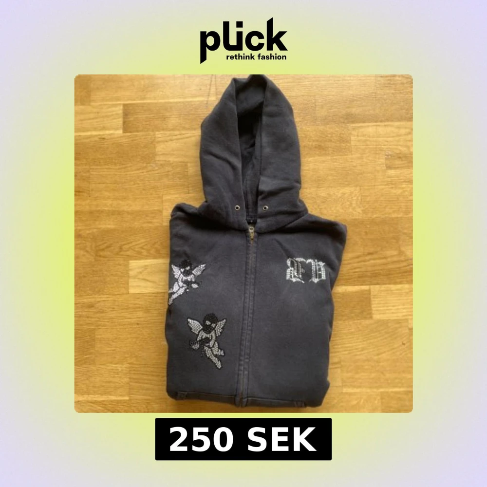 Svart hoodie med dragkedja och huva, dekorerad med strassänglar och texten 'GUARDIANS' på ryggen. Framsidan har coola strassdetaljer och fickor. Perfekt för dig som gillar streetstyle och unika detaljer.Tyvär har några pärlor ramlat av.