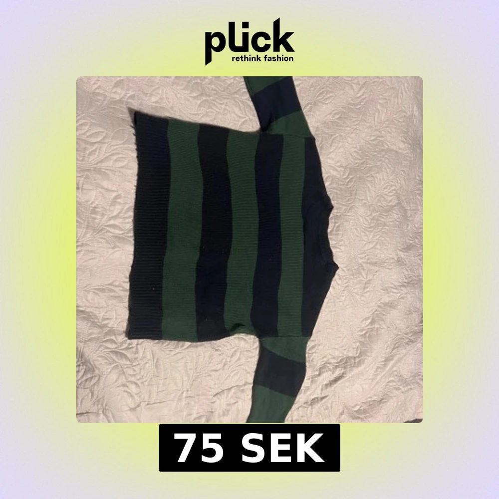 Säljer en chill stickad tröja med breda gröna och svarta ränder. Tröjan har rund hals och långa ärmar, perfekt för att hålla sig varm. Ribbstickad vid muddar och nederkant för extra comfy känsla. Passar dig som gillar klassisk streetstyle.