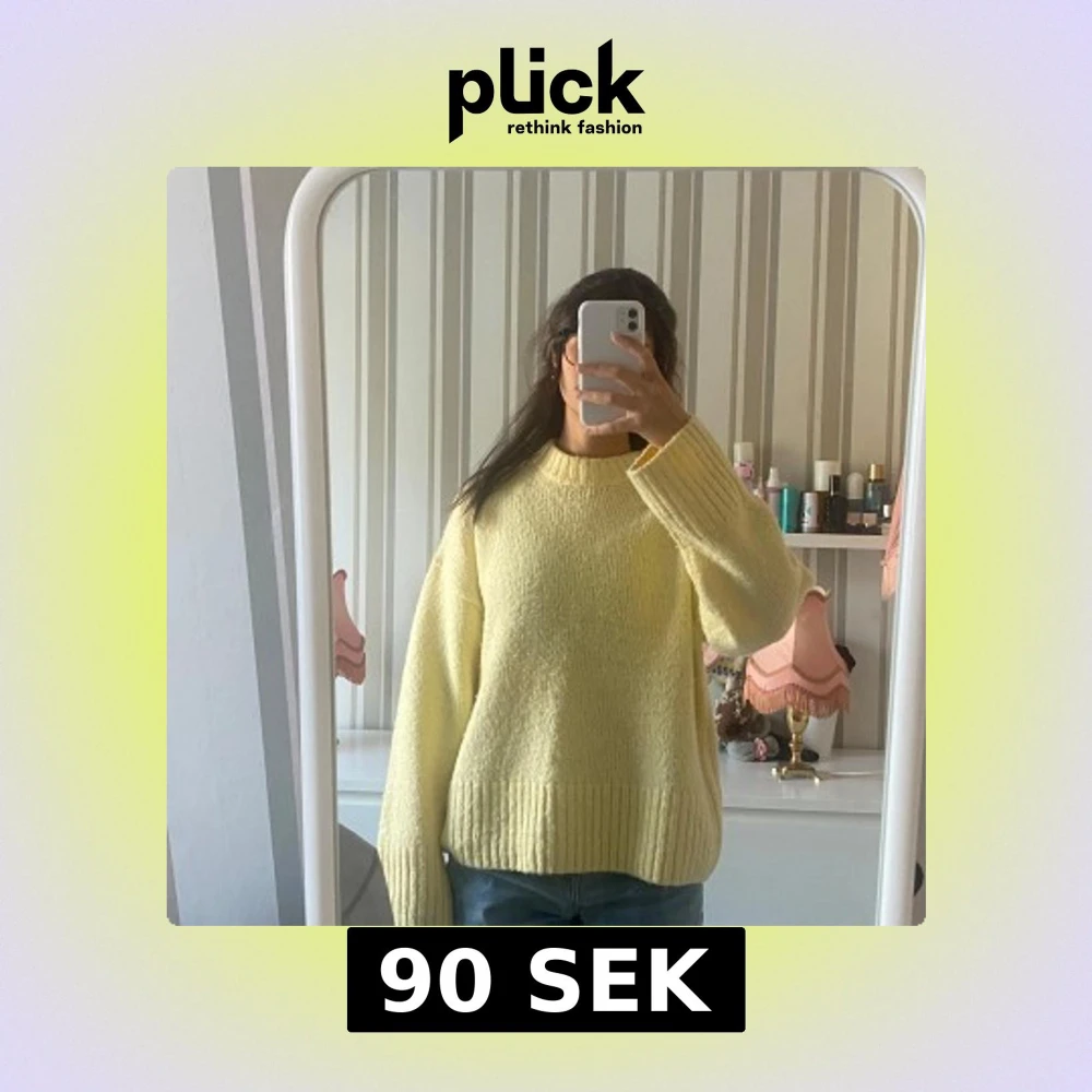 Mysig ljusgul stickad tröja med bred ribbad kant vid nederdel och ärmslut. Tröjan har en rund halsringning och långa ärmar med avslappnad, oversized passform.